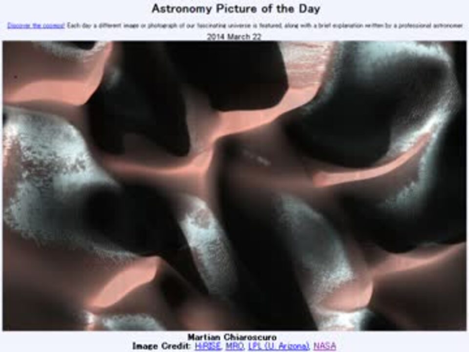 <b>2014年3月22日Astronomy Picture of the Day<br />Martian Chiaroscuro 「火星の陰影法」</b><br /><br />APODとはNASAの天文学者が、毎日天文に関する画像に説明を添えて公開しているサイトです。<br />英語の勉強に読んでます。間違いがあれば指摘頂けると嬉しいです。<br /><br /><b>美しい写真と原文</b><br /><a href="http://apod.nasa.gov/apod/ap140322.html" target="_blank" rel="noopener nofollow">http://apod.nasa.gov/apod/ap140322.html</a><br /><b>お借りした素材</b><br />Flickrより<br />"Flare" by Phil Snyder<br /><b>お借りした音源</b><br /><a href="https://commons.nicovideo.jp/works/nc82753" target="_blank" rel="noopener">nc82753</a>「降り積もる」 by こおろぎ<br /><br />APODreadingマイリスト <a href="https://www.nicovideo.jp/mylist/32170692" target="_blank" rel="noopener">mylist/32170692</a> (<a href="https://www.nicovideo.jp/watch/sm23168071" class="watch">sm23168071</a><前日 翌日><a href="https://www.nicovideo.jp/watch/sm23183300" class="watch">sm23183300</a>)<br /><br />Twitter:Cc_jabberwock <br /><br />転載はご遠慮下さい。解らない事が有ったら気軽に聞いてみて下さい。調べてきます