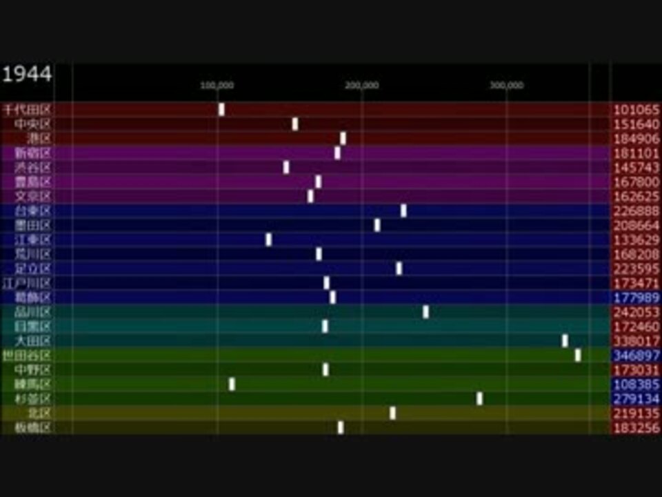 東京23区の過去90年間の人口推移(ほぼ5年毎の人口データ)を視覚化してみました。<br /><br />参考:国勢調査人口<br />BGM:「トランペット吹きの休日」<br />投稿動画:<a href="https://www.nicovideo.jp/mylist/9016552" target="_blank" rel="noopener">mylist/9016552</a><br /><br />Youtube(HD画質):<a href="http://www.youtube.com/watch?v=sQMtfTZUPtk" target="_blank" rel="noopener nofollow">http://www.youtube.com/watch?v=sQMtfTZUPtk</a>