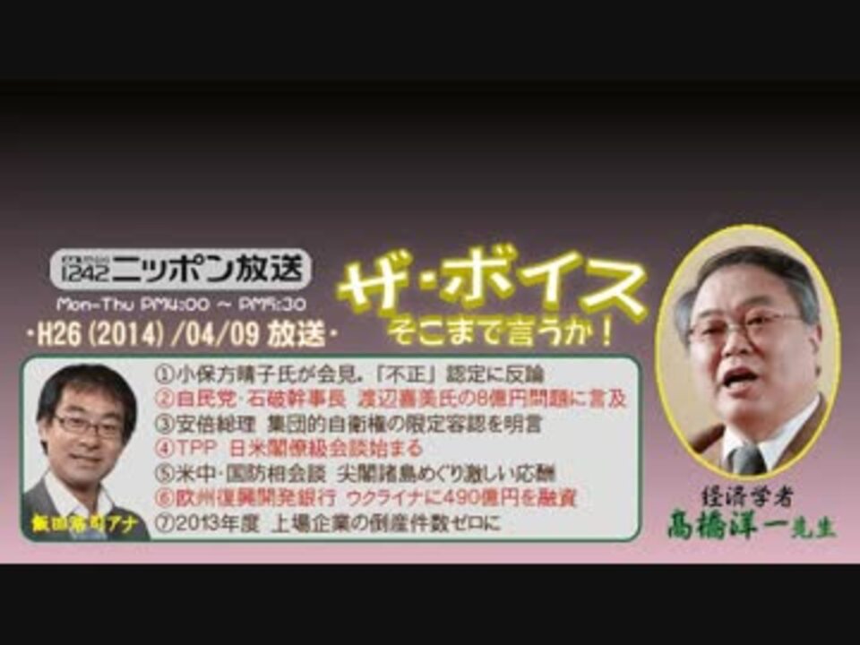 今日は、小保方さんが記者会見を開くということで朝から大騒ぎでしたが、この一連の騒動について、今回、高橋先生が仰ったことは目から鱗でした。<br />曰く「論文は世に出てからがスタート。後に中身を吟味され淘汰されていくだけなのに、最初から完璧さや性急な結果を求めて批判してちゃ、多くの"非常識"さから生まれる新発見の目を潰しちゃうよ(意訳」<br /><br />ああ、気がつけば私も、事の本質を見誤っていた感じです。そういや経済学なんて、「人口減少デフレ論」だの好き勝手なこと言っても平気のへーですもんねぇw。科学を見守る目も、そのくらいの度量が必要ですよね。……もちろん、理研の姿勢は許せませんが。<br /><br />あ、久しぶりにツイートが採用されました♪(^^ <a href="#" class="seekTime" data-seekTime="56:20" onclick="seekNicoPlayer('#56:20'); return false;">#56:20</a>~<br />□<a href="https://www.nicovideo.jp/mylist/36340069" target="_blank" rel="noopener">mylist/36340069</a>□<a href="https://www.nicovideo.jp/mylist/41644857" target="_blank" rel="noopener">mylist/41644857</a>