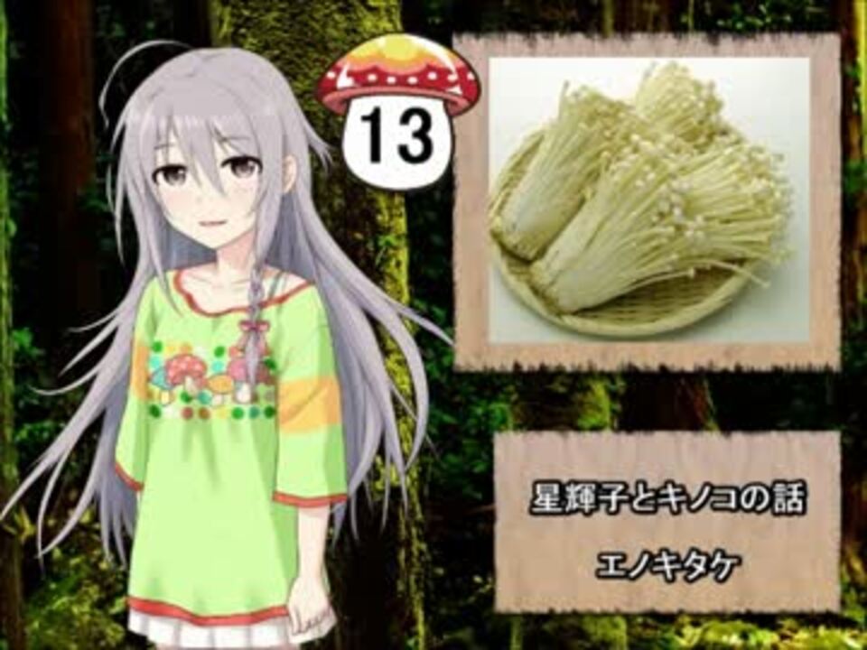 星輝子ちゃんにエノキタケについて話してもらいました。<br>キノコに興味を持ってくれる人と、<br>輝子ちゃんが好きな人が増えてくれると嬉しいです。<br>立ち絵は晴嵐改様よりお借りしています。<br><br>そろそろ暖かくなり、キノコ栽培にもいい季節になってきました。<br>皆様も栽培キットで育ててみてはいかがでしょうか?<br><br>【前回】ホテルきのこの森 → <a href="https://www.nicovideo.jp/watch/sm23256760" class="watch">sm23256760</a> <br>【次回】カバノアナタケ → <a href="https://www.nicovideo.jp/watch/sm23399312" class="watch">sm23399312</a> <br><br>星輝子とキノコの話 → <a href="https://www.nicovideo.jp/mylist/40796192" target="_blank" rel="noopener">mylist/40796192</a><br>part1まとめ → <a href="https://www.nicovideo.jp/mylist/54190693" target="_blank" rel="noopener">mylist/54190693</a><br>単発・MAD → <a href="https://www.nicovideo.jp/mylist/54477433" target="_blank" rel="noopener">mylist/54477433</a><br><br>2020/6/13 largo様、ことり様、<span style="color: #000000; font-size: 13px;">kenichi様、</span>宣伝ありがとうございます! <br>