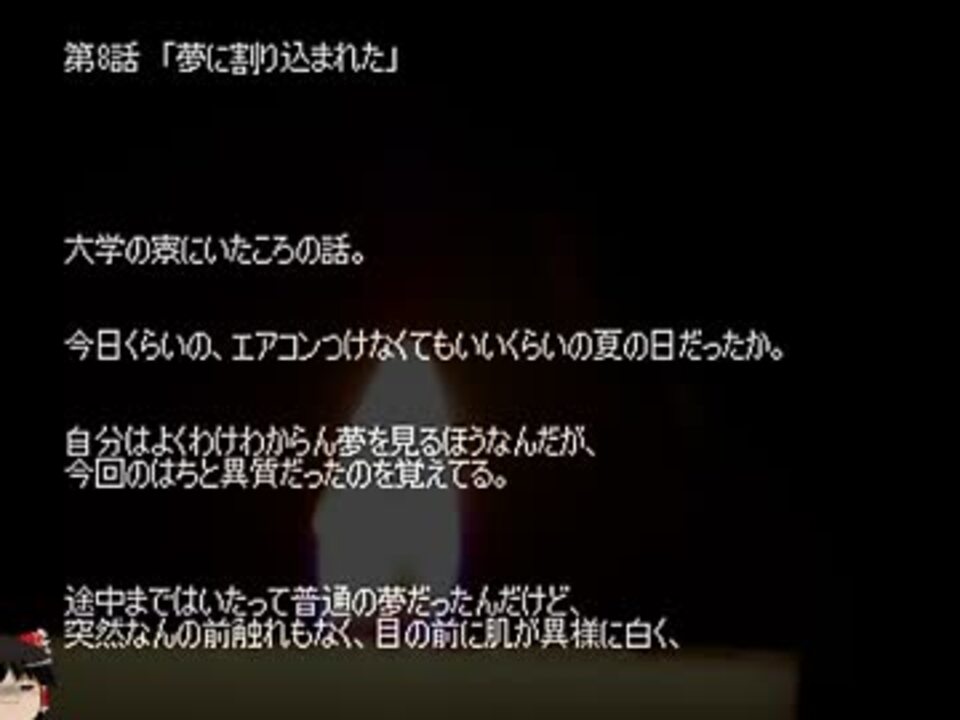 我が家のゆっくりが、オカ板の百物語(2006年7月22日開催)から読んでくれました。<br />本シリーズは話を選定しておりませんが、一部文章を校正してあります。<br /><br />第8話:<a href="#" class="seekTime" data-seekTime="00:00" onclick="seekNicoPlayer('#00:00'); return false;">#00:00</a> 第9話:<a href="#" class="seekTime" data-seekTime="03:32" onclick="seekNicoPlayer('#03:32'); return false;">#03:32</a> 第10話:<a href="#" class="seekTime" data-seekTime="07:40" onclick="seekNicoPlayer('#07:40'); return false;">#07:40</a> <br /><br />人によっては残酷と感じる表現が含まれる場合がありますので、<br />お気に召されないお話があった場合は、飛ばしてご視聴下さい。<br /><br />自動で次の動画に移動するように設定してあります。<br />(最新の動画のみ、最初の動画に移動します。)<br />ループが嫌な方は、お手数なのですが終わり際で停止ボタンを<br />押すようにして下さい。<br /><br />バックナンバー>><a href="https://www.nicovideo.jp/mylist/42927813" target="_blank" rel="noopener">mylist/42927813</a><br />別シリーズ>><a href="https://www.nicovideo.jp/mylist/35018789" target="_blank" rel="noopener">mylist/35018789</a><br />使用素材>><a href="https://commons.nicovideo.jp/works/nc40363" target="_blank" rel="noopener">nc40363</a>、<a href="https://commons.nicovideo.jp/works/nc91418" target="_blank" rel="noopener">nc91418</a>