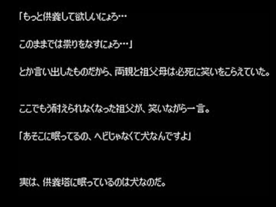 我が家のゆっくりが、オカ板から読んでくれました。<br />一部文章を校正してあります。<br /><br />1話目:<a href="#" class="seekTime" data-seekTime="00:00" onclick="seekNicoPlayer('#00:00'); return false;">#00:00</a> 飛び込んだ先(グロ注意) <br />2話目:<a href="#" class="seekTime" data-seekTime="02:28" onclick="seekNicoPlayer('#02:28'); return false;">#02:28</a> 欲しがる妹 <br />3話目:<a href="#" class="seekTime" data-seekTime="05:01" onclick="seekNicoPlayer('#05:01'); return false;">#05:01</a> ヘビ塚 <br /><br />人によっては残酷と感じる表現が含まれる場合がありますので<br />お気に召されないお話があった場合は、飛ばしてご視聴下さい。<br /><br />自動で次の動画に移動するように設定してあります。<br />(最新の動画のみ、最初の動画に移動します。)<br /><br />ループが嫌な方は、お手数なのですが終わり際で停止ボタンを<br />押すようにして下さい。<br /><br />主コミュ>>co120573<br />Twitter>><a href="https://twitter.com/ikka_gunma" target="_blank" rel="noopener nofollow">https://twitter.com/ikka_gunma</a><br />バックナンバー>><a href="https://www.nicovideo.jp/mylist/31377965" target="_blank" rel="noopener">mylist/31377965</a><br />別シリーズ>><a href="https://www.nicovideo.jp/mylist/35018789" target="_blank" rel="noopener">mylist/35018789</a>