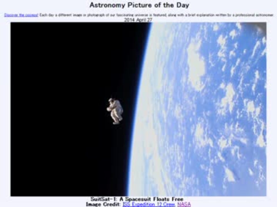 <b>2014年 4月27日 Astronomy Picture of the Day<br />SuitSat-1: A Spacesuit Floats Free 「スーツサット1号:浮遊する宇宙服」</b><br /><br />APODとはNASAの天文学者が、毎日天文に関する画像に説明を添えて公開しているサイトです。<br />英語の勉強に読んでます。間違いがあれば指摘頂けると嬉しいです。<br /><br /><b>美しい写真と原文</b><br /><a href="http://apod.nasa.gov/apod/ap140427.html" target="_blank" rel="noopener nofollow">http://apod.nasa.gov/apod/ap140427.html</a><br /><b>お借りした音源</b><br /><a href="https://commons.nicovideo.jp/works/nc85530" target="_blank" rel="noopener">nc85530</a>「秘密の兵器工場」 by 884yuu<br /><br />APODreadingマイリスト <a href="https://www.nicovideo.jp/mylist/32170692" target="_blank" rel="noopener">mylist/32170692</a> (<a href="https://www.nicovideo.jp/watch/sm23442297" class="watch">sm23442297</a><前日 翌日><a href="https://www.nicovideo.jp/watch/sm23456471" class="watch">sm23456471</a>)<br /><br />Twitter:Cc_jabberwock <br /><br />転載はご遠慮下さい。解らない事が有ったら気軽に聞いてみて下さい。調べてきます
