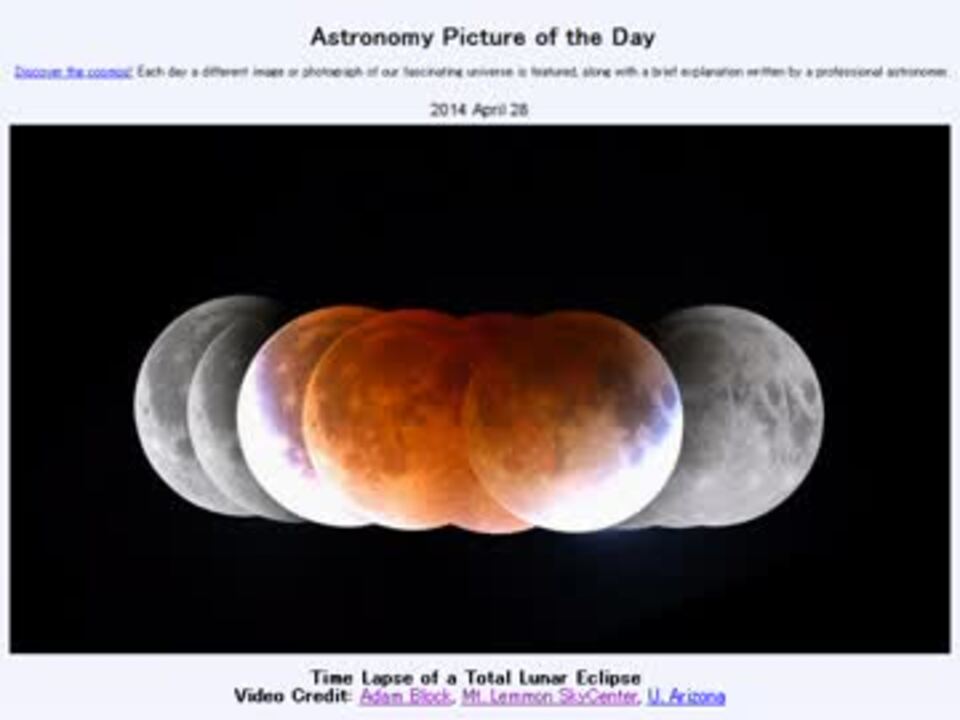 <b>2014年 4月28日 Astronomy Picture of the Day<br />Time Lapse of a Total Lunar Eclipse 「皆既月食の微速度撮影動画」</b><br /><br />APODとはNASAの天文学者が、毎日天文に関する画像に説明を添えて公開しているサイトです。<br />英語の勉強に読んでます。間違いがあれば指摘頂けると嬉しいです。<br /><br /><b>美しい写真と原文</b><br /><a href="http://apod.nasa.gov/apod/ap140428.html" target="_blank" rel="noopener nofollow">http://apod.nasa.gov/apod/ap140428.html</a><br /><br />APODreadingマイリスト <a href="https://www.nicovideo.jp/mylist/32170692" target="_blank" rel="noopener">mylist/32170692</a> (<a href="https://www.nicovideo.jp/watch/sm23449246" class="watch">sm23449246</a><前日 翌日><a href="https://www.nicovideo.jp/watch/sm23464192" class="watch">sm23464192</a>)<br /><br />Twitter:Cc_jabberwock <br /><br />転載はご遠慮下さい。解らない事が有ったら気軽に聞いてみて下さい。調べてきます <br />最後駄洒落を再現しようとして壮絶に自爆しています