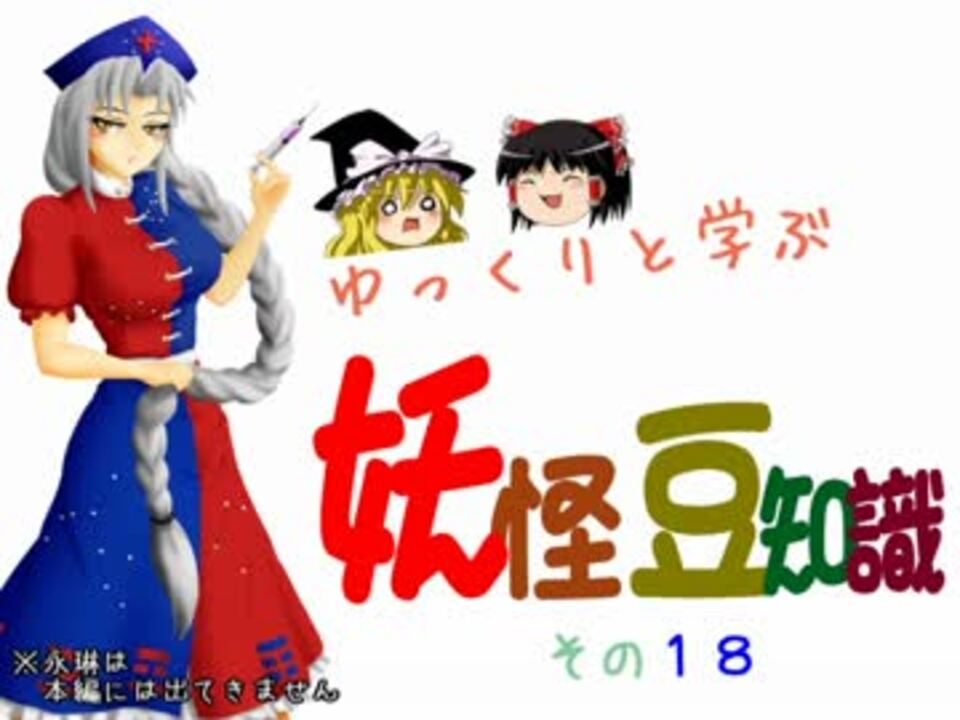 ゆっくり霊夢とゆっくり魔理沙でお送りする、ゆるゆる妖怪講座!<br /><br />第十八弾は、婆妖怪の斬新な学び方<br />「婆妖怪特集-前編」<br /><br />①ゆっくり霊夢:妖怪講師 ゆっくり魔理沙:一般人代表<br />②妖怪について大まかに語るだけのゆるい茶番動画<br />③この動画は『ゆっくり霊夢の持論』をベースに、水木しげる先生の鬼太郎や過去の妖怪資料など多種多様に織り交ぜて構成しております<br />④伝承や噂も含まれるので話半分でお楽しみ下さい<br /><br />それでは霊夢のうんちく、魔理沙のリアクションをお楽しみ下さいw<br /><br /> 17.5話 ⇒<a href="https://www.nicovideo.jp/watch/sm23672026" class="watch">sm23672026</a><br /> 18.5話 ⇒<a href="https://www.nicovideo.jp/watch/sm23722666" class="watch">sm23722666</a><br /><br /> 閑話休題2 ⇒<a href="https://www.nicovideo.jp/watch/sm23590238" class="watch">sm23590238</a><br /><br /><br />妖怪豆知識シリーズ ⇒<a href="https://www.nicovideo.jp/mylist/41206934" target="_blank" rel="noopener">mylist/41206934</a><br />≪追記≫鯖味噌(荒野沖)様、B#様 宣伝有難うございます!