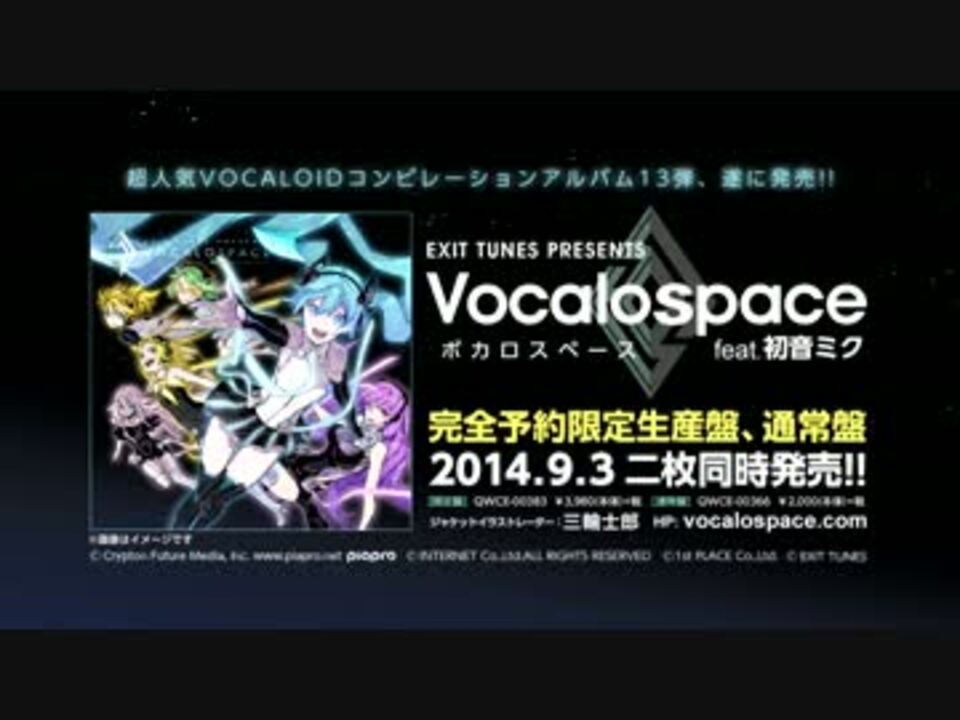 11作連続オリコントップ10入り!No.1ボカロコンピ最新作!<br />今回はシリーズ初となる完全予約限定生産盤と通常盤の二形態でリリース決定!<br /><br />2014.9.3 Release!<br />『EXIT TUNES PRESENTS Vocalospace feat.初音ミク』<br /><br />ジャケットイラスト:三輪士郎<br /><br />★完全予約限定生産盤には<br />三輪士郎、左、かんざきひろ、redjuice等超豪華イラストレーター参加!!150P超画集付き! <br />さらに、限定・通常盤共にシリーズ初ラバーストラップ付き!<br /><br />公式HP:<a href="http://vocalospace.com/" target="_blank" rel="noopener nofollow">http://vocalospace.com/</a><br />予約はこちら:<a href="http://bit.ly/1xLfQ2m" target="_blank" rel="noopener nofollow">http://bit.ly/1xLfQ2m</a><b><br />※予約受付期間:2014年7月10日(木)まで</b><br /><br />※クロスフェードは収録曲一部です。楽曲はリマスタリング高音質収録されます<br /><br />Vocalofuture feat.初音ミク:(<a href="https://www.nicovideo.jp/watch/sm21767024" class="watch">sm21767024</a>)