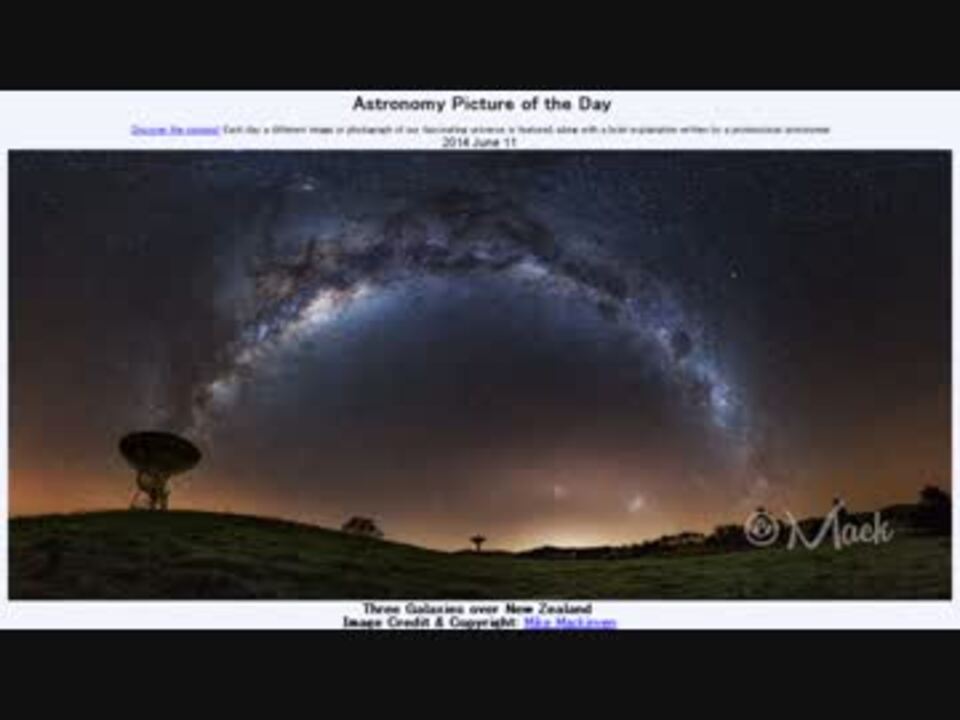 <b>2014年6月11日Astronomy Picture of the Day<br />Three Galaxies over New Zealand 「ニュージーランドの3つの銀河」</b><br /><br />APODとはNASAの天文学者が、毎日天文に関する画像に説明を添えて公開しているサイトです。<br />英語の勉強に読んでます。間違いがあれば指摘頂けると嬉しいです。<br /><br /><b>美しい写真と原文</b><br /><a href="http://apod.nasa.gov/apod/ap140611.html" target="_blank" rel="noopener nofollow">http://apod.nasa.gov/apod/ap140611.html</a><br /><b>お借りした素材</b><br />Wikipediaより<br />"New Zealand location map" by NordNordWest<br />Flickrより<br />"The Warkworth Satellite Station" by Sids1<br /><b>お借りした音源</b><br /><a href="https://commons.nicovideo.jp/works/nc77614" target="_blank" rel="noopener">nc77614</a>「仮想BGM」 by 愛哀<br /><br />APODreadingマイリスト <a href="https://www.nicovideo.jp/mylist/32170692" target="_blank" rel="noopener">mylist/32170692</a> (<a href="https://www.nicovideo.jp/watch/sm23772062" class="watch">sm23772062</a><前日 翌日><a href="https://www.nicovideo.jp/watch/sm23790814" class="watch">sm23790814</a>)<br /><br />転載はご遠慮下さい。解らない事が有ったら気軽に聞いてみて下さい。調べてきます<br />2文目がいまいちよくわかりません。