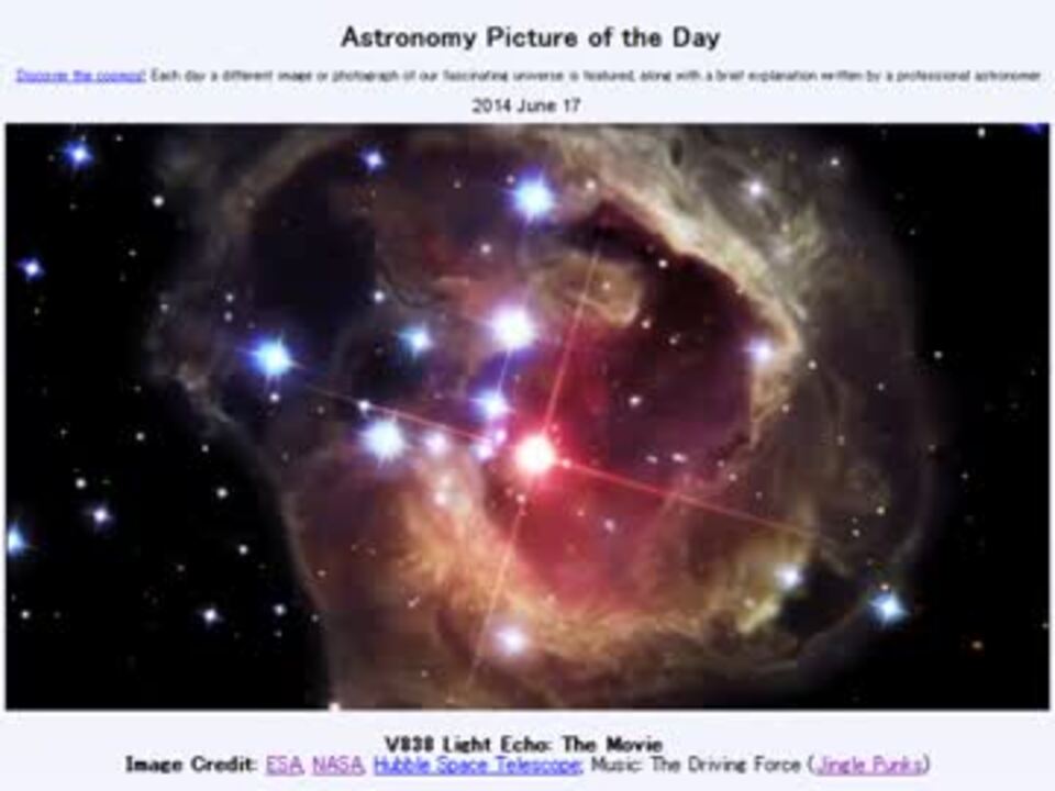<b>2014年 6月17日 Astronomy Picture of the Day<br />V838 Light Echo: The Movie 「いっかくじゅう座V838星の光エコーの動画」</b><br /><br />APODとはNASAの天文学者が、毎日天文に関する画像に説明を添えて公開しているサイトです。<br />英語の勉強に読んでます。間違いがあれば指摘頂けると嬉しいです。<br /><br /><b>美しい写真と原文</b><br /><a href="http://apod.nasa.gov/apod/ap140617.html" target="_blank" rel="noopener nofollow">http://apod.nasa.gov/apod/ap140617.html</a><br /><b>お借りした素材</b><br />Wikipediaより<br />"Monoceros IAU" by IAU and Sky & Telescope magazine<br /><br />APODreadingマイリスト <a href="https://www.nicovideo.jp/mylist/32170692" target="_blank" rel="noopener">mylist/32170692</a> (<a href="https://www.nicovideo.jp/watch/sm23817450" class="watch">sm23817450</a><前日 翌日><a href="https://www.nicovideo.jp/watch/sm23840277" class="watch">sm23840277</a>)<br /><br />Twitter:Cc_jabberwock <br /><br />転載はご遠慮下さい。<br />納得できない出来なのですが、時間がないので投稿します。<br />星周囲の塵の輪切りが見えてると思うと解りやすいと思います