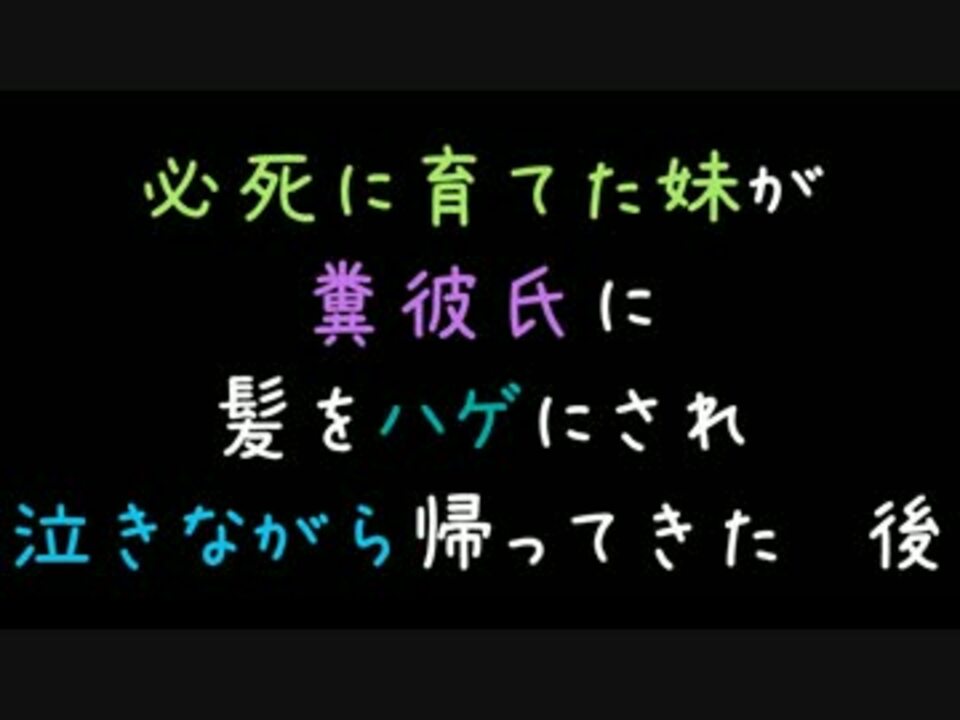 お姉ちゃん、あんたって子は……(´;ω;)<br />妹思いのほんとに良いお姉ちゃんですねぇ、羨ましい(´・ω・)<br /><br /><br />糞彼氏も、相応の報いを受けて何より<br />住職目指して頑張って(^^)<br /><br /><br />次作 【ポイ捨て注意したいけどチキンで出来ない俺が良い方法みつけた^^】:<a href="https://www.nicovideo.jp/watch/sm23891663" class="watch">sm23891663</a><br /><br />【必死に育てた妹が糞彼氏に髪をハゲにされ、泣きながら帰ってきた 前】:<a href="https://www.nicovideo.jp/watch/sm23874732" class="watch">sm23874732</a><br />【俺店長 嫁アルバイト 好きな気持ちがムクムクと】:<a href="https://www.nicovideo.jp/watch/sm23867359" class="watch">sm23867359</a><br />【歯型取ろうとすると指を舐めまわしてくるキチ患者が……】:<a href="https://www.nicovideo.jp/watch/sm23859196" class="watch">sm23859196</a><br /><br />こぴぺ系投稿動画まとめ・BGM詳細:<a href="https://www.nicovideo.jp/mylist/32575780" target="_blank" rel="noopener">mylist/32575780</a> その2:<a href="https://www.nicovideo.jp/mylist/36385270" target="_blank" rel="noopener">mylist/36385270</a><br /> その3:<a href="https://www.nicovideo.jp/mylist/39451971" target="_blank" rel="noopener">mylist/39451971</a><br /><br />