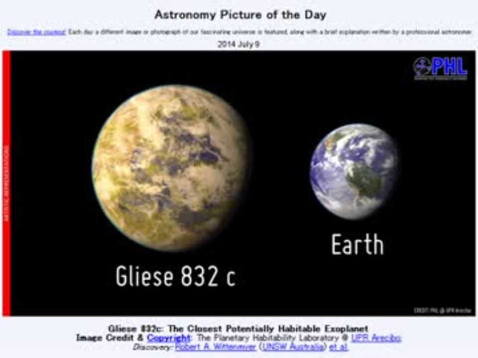 <b>2014年 7月9日 Astronomy Picture of the Day<br />Gliese 832c: The Closest Potentially Habitable Exoplanet 「グリーゼ832C:最も近い、生命に適した環境である可能性のある系外惑星」</b><br /><br />APODとはNASAの天文学者が、毎日天文に関する画像に説明を添えて公開しているサイトです。<br />英語の勉強に読んでます。間違いがあれば指摘頂けると嬉しいです。<br /><br /><b>美しい写真と原文</b><br /><a href="http://apod.nasa.gov/apod/ap140709.html" target="_blank" rel="noopener nofollow">http://apod.nasa.gov/apod/ap140709.html</a><br /><b>お借りした音源</b><br /><a href="https://commons.nicovideo.jp/works/nc22279" target="_blank" rel="noopener">nc22279</a>「ほのほ -little light of life-」 by しましまP<br /><br />APODreadingマイリスト <a href="https://www.nicovideo.jp/mylist/32170692" target="_blank" rel="noopener">mylist/32170692</a> (<a href="https://www.nicovideo.jp/watch/sm23991187" class="watch">sm23991187</a><前日 翌日><a href="https://www.nicovideo.jp/watch/sm24007147" class="watch">sm24007147</a>)<br /><br />Twitter:Cc_jabberwock <br /><br />転載はご遠慮下さい。解らない事が有ったら気軽に聞いてみて下さい。調べてきます<br />題名長すぎた!