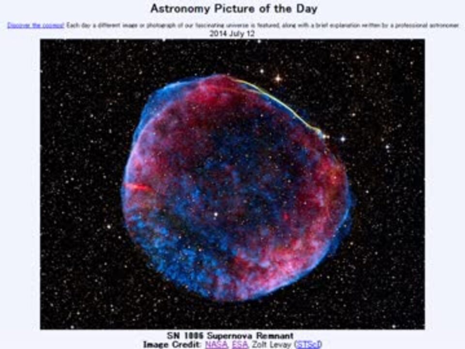 <b>2014年 7月12日 Astronomy Picture of the Day<br />SN 1006 Supernova Remnant 「超新星残骸:SN 1006」</b><br /><br />APODとはNASAの天文学者が、毎日天文に関する画像に説明を添えて公開しているサイトです。<br />英語の勉強に読んでます。間違いがあれば指摘頂けると嬉しいです。<br /><br /><b>美しい写真と原文</b><br /><a href="http://apod.nasa.gov/apod/ap140712.html" target="_blank" rel="noopener nofollow">http://apod.nasa.gov/apod/ap140712.html</a><br /><b>お借りした素材</b><br />Flickrより<br />"Scorpius in deep twilight" by jpstanley<br />Wikipediaより<br />"Artist’s impression of vampire star" by ESO<br />Youtubeより<br />"Cloud Chamber" by Stephen Curry<br /><b>お借りした音源</b><br /><a href="https://commons.nicovideo.jp/works/nc50257" target="_blank" rel="noopener">nc50257</a>「悲しみに咲く花」 by VFR<br /><br />APODreadingマイリスト <a href="https://www.nicovideo.jp/mylist/32170692" target="_blank" rel="noopener">mylist/32170692</a> (<a href="https://www.nicovideo.jp/watch/sm24012572" class="watch">sm24012572</a><前日 翌日><a href="https://www.nicovideo.jp/watch/sm24020687" class="watch">sm24020687</a>)<br /><br />Twitter:Cc_jabberwock <br /><br />転載はご遠慮下さい。解らない事が有ったら気軽に聞いてみて下さい。