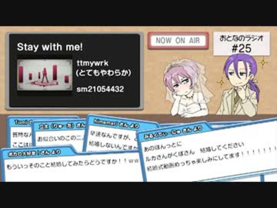 <font color="d00281"><b>人妻になりました。</b></font><br />1年ぶりの投稿!!ドキドキです!!<br /><br />●OP<a href="https://www.nicovideo.jp/watch/sm21054432" class="watch">sm21054432</a> ●紹介1<a href="https://www.nicovideo.jp/watch/sm17688027" class="watch">sm17688027</a> ●紹介2<a href="https://www.nicovideo.jp/watch/sm21232398" class="watch">sm21232398</a> ●ED<a href="https://www.nicovideo.jp/watch/sm17720998" class="watch">sm17720998</a><br />●HVP…じゃむぱん(<a href="https://www.nicovideo.jp/mylist/4253367" target="_blank" rel="noopener">mylist/4253367</a>)<br />■過去紹介曲<a href="https://www.nicovideo.jp/mylist/12512202" target="_blank" rel="noopener">mylist/12512202</a><br /><br /><font color="ff8800"><b>メールフォーム</b>→<u><a href="http://tinyurl.com/37bb6l6" target="_blank" rel="noopener nofollow">http://tinyurl.com/37bb6l6</a></u><br />画像は<u>funkorogashi.music@gmail.com</u>へ。</font><br /><br /><a href="https://www.nicovideo.jp/watch/sm21411155" class="watch">sm21411155</a><<第24回 第26回>><a href="https://www.nicovideo.jp/watch/sm27142806" class="watch">sm27142806</a><br /><br />■おとラジ<a href="https://www.nicovideo.jp/mylist/11994464" target="_blank" rel="noopener">mylist/11994464</a> ■作品集<a href="https://www.nicovideo.jp/mylist/11700307" target="_blank" rel="noopener">mylist/11700307</a><br />■twitter…<u>scarabee</u> ■ブログ<u><a href="http://www.voiceblog.jp/scarabee/" target="_blank" rel="noopener nofollow">http://www.voiceblog.jp/scarabee/</a></u></b></b>