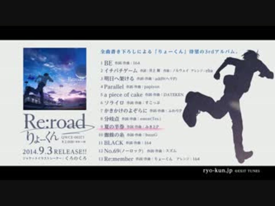 9月3日発売 3rdアルバム<br />『Re:road / りょーくん』<br />全収録曲のクロスフェード動画です。<br /><br />Illustration:くろのくろ<br />Mix&Mastering:yasu(<a href="https://www.nicovideo.jp/mylist/24600477" target="_blank" rel="noopener">mylist/24600477</a>)<br /> <br />わたし(<a href="https://www.nicovideo.jp/mylist/21309091" target="_blank" rel="noopener">mylist/21309091</a>) <br />Twitter⇒ryokun_san<br /><br />【数量限定特典】<br />■「たま」が描く全3種オリジナルステンレスストラップ(スマホ対応)<br />■「くろのくろ」が描くB2ポスタープレゼント(一部店舗除く)<br /><br />公式HP:ryo-kun.jp <br />店舗特典ページ:<a href="http://ryo-kun.jp/present.html" target="_blank" rel="noopener nofollow">http://ryo-kun.jp/present.html</a><br />amazon:<a href="http://www.amazon.co.jp/dp/B00KMP9L1C" target="_blank" rel="noopener nofollow">http://www.amazon.co.jp/dp/B00KMP9L1C</a><br />