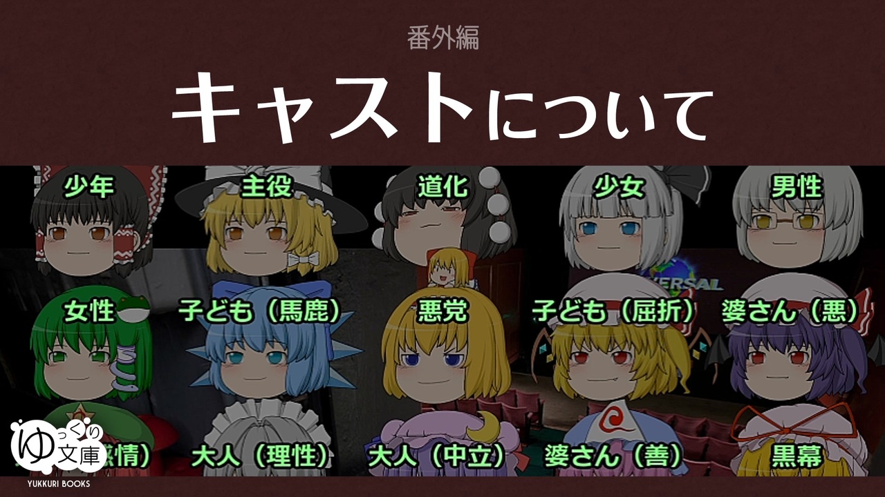 <span style="color: red;"><strong>028x キャストが愛おしいのです──</strong></span><br>需要ないけど雑談。こんなことを思いながら作っています。アリスに悪役ばかりやらせて、ごめんなさい。<br><br>●ゆっくり文庫:番外編 <a href="https://www.nicovideo.jp/mylist/63565302" target="_blank" rel="noopener">mylist/63565302</a><br><a href="https://www.nicovideo.jp/watch/sm22624651" class="watch">sm22624651</a> うp主アンケートへの返信<br><a href="https://www.nicovideo.jp/watch/sm24383138" class="watch">sm24383138</a> キャストについて<br><a href="https://www.nicovideo.jp/watch/sm25443791" class="watch">sm25443791</a> 翻案について<br><a href="https://www.nicovideo.jp/watch/sm28631370" class="watch">sm28631370</a> 表現について<br><a href="https://www.nicovideo.jp/watch/sm31137166" class="watch">sm31137166</a> 選択について<br><a href="https://www.nicovideo.jp/watch/sm34268365" class="watch">sm34268365</a> 5周年記念雑談<br><a href="https://www.nicovideo.jp/watch/sm34304457" class="watch">sm34304457</a> ゆっくり小泉八雲 観劇記<br><a href="https://www.nicovideo.jp/watch/sm34949914" class="watch">sm34949914</a> 文庫座談会:序章<br><a href="https://www.nicovideo.jp/watch/sm34987146" class="watch">sm34987146</a> 座談会:打ち上げ<br><a href="https://www.nicovideo.jp/watch/sm35785040" class="watch">sm35785040</a> 文庫サーバの話<br><a href="https://www.nicovideo.jp/watch/sm36092371" class="watch">sm36092371</a> ゆっワイのセブンさん<br><a href="https://www.nicovideo.jp/watch/sm36213124" class="watch">sm36213124</a> 旋風計画の嶋田さん<br><a href="https://www.nicovideo.jp/watch/sm36368689" class="watch">sm36368689</a> 旋風計画の質問箱<br><a href="https://www.nicovideo.jp/watch/sm36584505" class="watch">sm36584505</a> プレザントドリーム観劇記<br><br>---<br>ゆっくり文庫:全部<br><a href="https://www.nicovideo.jp/mylist/74874627" target="_blank" rel="noopener">mylist/74874627</a><br>ゆっくり文庫:近況<br><a href="https://twitter.com/trynext" target="_blank" rel="noopener nofollow">https://twitter.com/trynext</a><br>---<br><br><br>