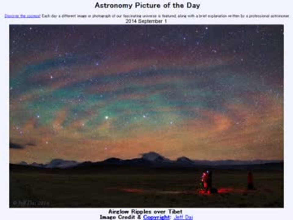 <b>2014年9月1日Astronomy Picture of the Day<br />Airglow Ripples over Tibet 「チベット上空の大気光」</b><br /><br />APODとはNASAの天文学者が、毎日天文に関する画像に説明を添えて公開しているサイトです。<br />英語の勉強に読んでます。間違いがあれば指摘頂けると嬉しいです。<br /><br /><b>美しい写真と原文</b><br /><a href="http://apod.nasa.gov/apod/ap140901.html" target="_blank" rel="noopener nofollow">http://apod.nasa.gov/apod/ap140901.html</a><br /><b>お借りした素材</b><br />Wikipediaより<br />"Tibet in China" by TUBS<br /><b>お借りした音源</b><br /><a href="https://commons.nicovideo.jp/works/nc85306" target="_blank" rel="noopener">nc85306</a>「まどろみの中」 by もっぴーさうんど<br /><br />APODreadingマイリスト <a href="https://www.nicovideo.jp/mylist/32170692" target="_blank" rel="noopener">mylist/32170692</a> (<a href="https://www.nicovideo.jp/watch/sm24402084" class="watch">sm24402084</a><前日 翌日><a href="https://www.nicovideo.jp/watch/sm24419628" class="watch">sm24419628</a>)<br /><br />転載はご遠慮下さい。解らない事が有ったら気軽に聞いてみて下さい。調べてきます<br />低気圧などで、低層の濃い大気が持ち上がると、水面に立つ波紋のように大気に波が起こる。とのことです