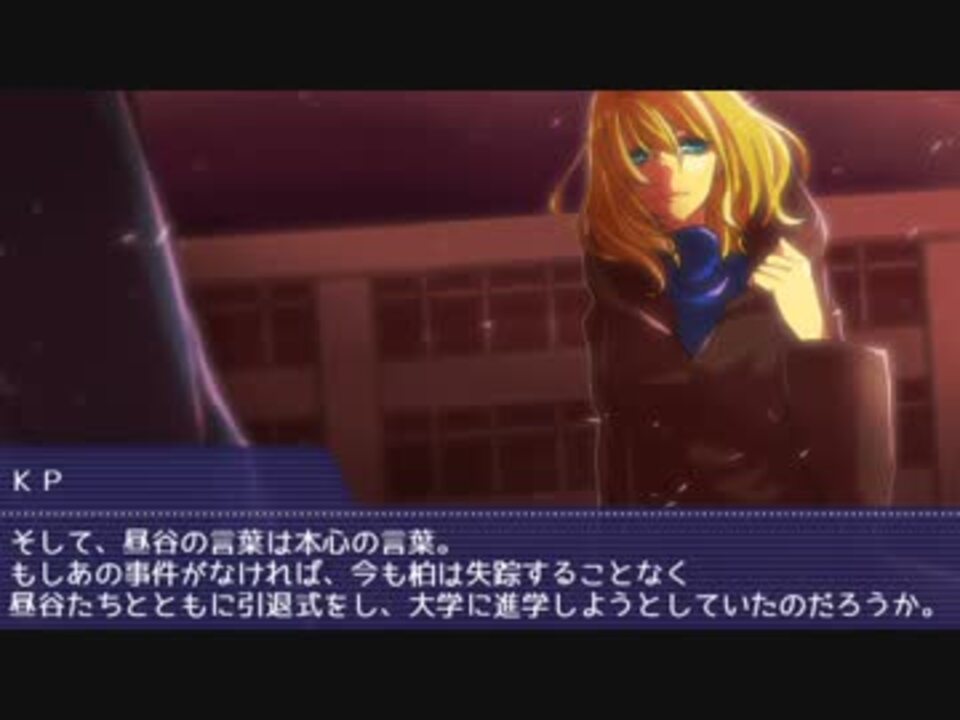 これはどどんとふで行われたセッションをリプレイ化したものです。<br />ただし、動画化するにあたり茶番を増量したりしたノベル風リプレイ動画になりますので苦手な方はブラウザバックをお願い致します。<br />尚、みくりさんの画像は許可を頂いて使用しております。<br /><br />参加メンバー(敬称略)<br />KP みれい<br />PC 佐々木 PL にゃんことすてっぷ<br />PC 深津 PL 針無シ<br />PC 入口 PL 出入口<br />PC 昼谷 PL もこもこ(うp主)<br />PC 沢渡 PL さーじぇ<br /><br />←前 <a href="https://www.nicovideo.jp/mylist/45631789" target="_blank" rel="noopener">mylist/45631789</a> 次→<a href="https://www.nicovideo.jp/watch/sm24852812" class="watch">sm24852812</a> <br />前作→<a href="https://www.nicovideo.jp/mylist/37121864" target="_blank" rel="noopener">mylist/37121864</a><br /><b><font color="red">新シリーズ→<a href="https://www.nicovideo.jp/watch/sm22578773" class="watch">sm22578773</a></font></b><br />