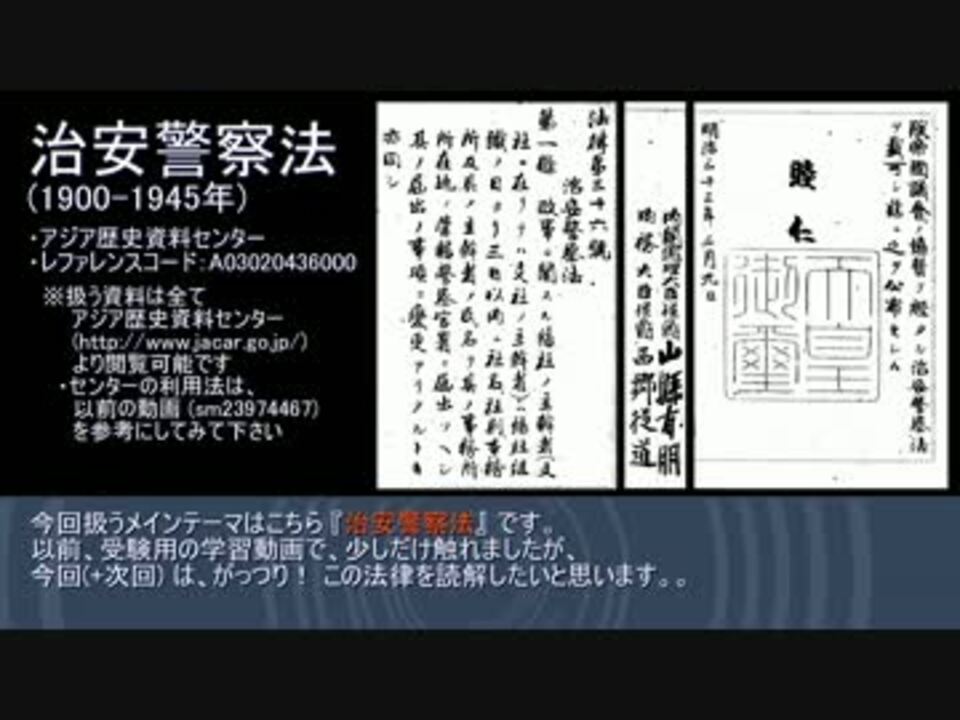 ※『治安警察法』について、解説・考察する動画です。<span style="color: #aa00dd;">「誰得動画」</span><span style="color: #000000;">ですね(笑)<br>※シジュウカラさんに広告宣伝していただきました。ありがとうございました!br><br>前)近デジ・アジ歴の使い方:<a href="https://www.nicovideo.jp/watch/sm23974467" class="watch">sm23974467</a><br>後)治安警察法の後編:<a href="https://www.nicovideo.jp/watch/sm24501904" class="watch">sm24501904</a><br>最初)幕末からはじめる日本史第1回:<a href="https://www.nicovideo.jp/watch/sm17102023" class="watch">sm17102023</a><br>まとめ)日本史まとめ:<a href="https://www.nicovideo.jp/mylist/30785733" target="_blank" rel="noopener">mylist/30785733</a></span><br><br><span style="color: #000000;">こんなこともやってます)ゆっくりギルガメシュ:<a href="https://www.nicovideo.jp/mylist/40403379" target="_blank" rel="noopener">mylist/40403379</a></span><br>