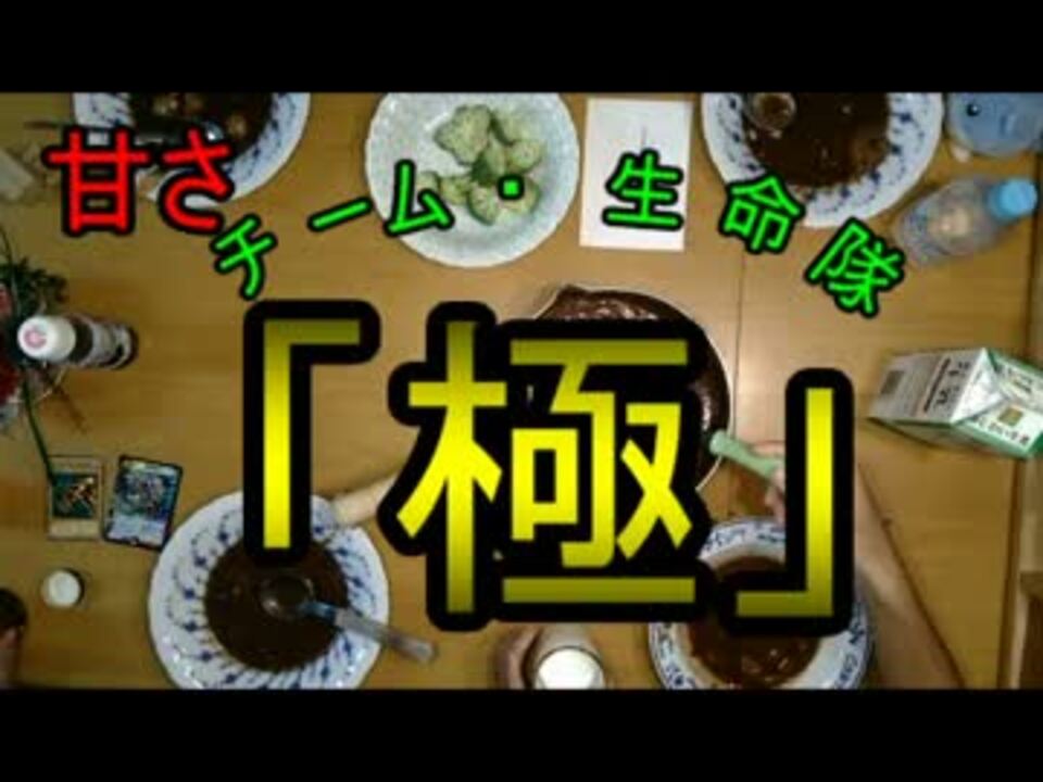 みなさんどうもチーム・生命隊です<br />子供の頃、みんな大好きだった甘いもの<br />ある日僕らは思いました<br />「あんなに美味しかった甘いもん全部混ぜたらめっちゃ美味なるんちゃうん!?」<br />これが悲劇の始まりでした<br />~隊員紹介~<br />・ゆるぎ<字幕青<br />・次郎<灰色<br />・なかちゃん<緑<br />・ティオ<赤<br /><br />[2014/10/13]念願の1000回再生突破!あざます!!<br /><br />[2014/12/17]目標の3000回再生突破!<br /><br />次回→<a href="https://www.nicovideo.jp/watch/sm30798915" class="watch">sm30798915</a> 今回の罰ゲーム企画→今度 今回の料理完食動画(コミュ限)→<a href="https://www.nicovideo.jp/watch/sm24660095" class="watch">sm24660095</a><br /> コメントが出来ない方はこちら→<a href="https://www.nicovideo.jp/watch/sm24528548" class="watch">sm24528548</a><br />生命隊マイリスト→<a href="https://www.nicovideo.jp/mylist/38521726" target="_blank" rel="noopener">mylist/38521726</a><br />料理動画マイリスト→<a href="https://www.nicovideo.jp/mylist/45746441" target="_blank" rel="noopener">mylist/45746441</a><br />ゆるぎおよび生命隊のコミュ→co2149197
