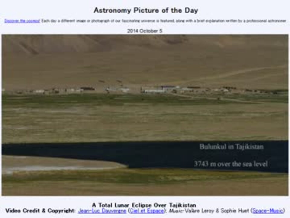 <b>2014年 10月5日 Astronomy Picture of the Day<br />A Total Lunar Eclipse Over Tajikistan 「タジキスタンの皆既月食」</b><br /><br />APODとはNASAの天文学者が、毎日天文に関する画像に説明を添えて公開しているサイトです。<br />英語の勉強に読んでます。間違いがあれば指摘頂けると嬉しいです。<br /><br /><b>美しい写真と原文</b><br /><a href="http://apod.nasa.gov/apod/ap141005.html" target="_blank" rel="noopener nofollow">http://apod.nasa.gov/apod/ap141005.html</a><br /><br />APODreadingマイリスト <a href="https://www.nicovideo.jp/mylist/32170692" target="_blank" rel="noopener">mylist/32170692</a> (<a href="https://www.nicovideo.jp/watch/sm24662564" class="watch">sm24662564</a><前日 翌日><a href="https://www.nicovideo.jp/watch/sm24678684" class="watch">sm24678684</a>)<br /><br />Twitter:Cc_jabberwock <br /><br />転載はご遠慮下さい。解らない事が有ったら気軽に聞いてみて下さい。調べてきます<br /><br />時事ネタが間に合わずすみません。<br />オリジナルはこちら<a href="http://vimeo.com/25808333" target="_blank" rel="noopener nofollow">http://vimeo.com/25808333</a>