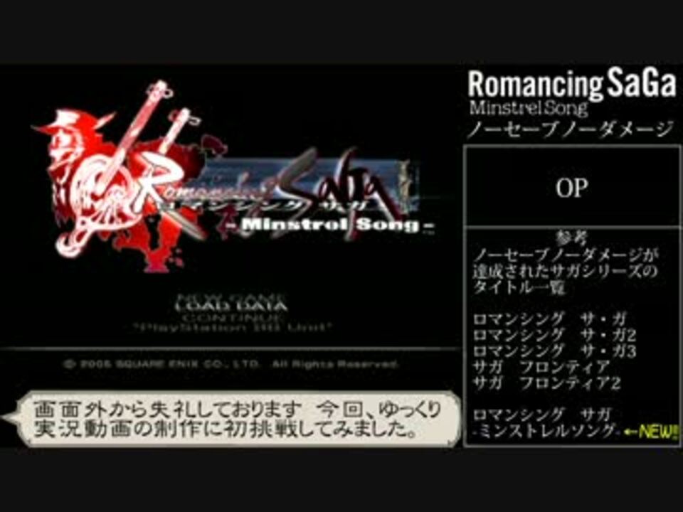 ロマンシングサガ ミンストレルソングのノーセーブノーダメージクリア動画です<br />ゆっくり音声での解説になりますので、苦手な方はご注意ください<br />biimシステムを採用していますが、R/T/Aではありません<br />■攻略条件<br />・開始からクリアまでセーブ禁止<br />・1以上のHPダメージ、LPダメージ、即死効果を受けた場合リセット<br />・逃走、技や術、MAの使用でのLP消費はダメージとみなさない<br />・バグや裏技の使用許可<br />・引き継ぎ許可<br />詳細はレポート(<a href="http://catasyo.tuzikaze.com/minsaga_nsnd/minsaga_nsnd0.html)で" target="_blank" rel="noopener nofollow">http://catasyo.tuzikaze.com/minsaga_nsnd/minsaga_nsnd0.html)で</a><br /> <br />Part1はゲームスタート(00:00)~「ミイラ商人」報酬獲得・仲間集め開始(00:22)<br />次回(Part2)→<a href="https://www.nicovideo.jp/watch/sm24686769" class="watch">sm24686769</a><br />シリーズ→<a href="https://www.nicovideo.jp/mylist/46112542" target="_blank" rel="noopener">mylist/46112542</a>