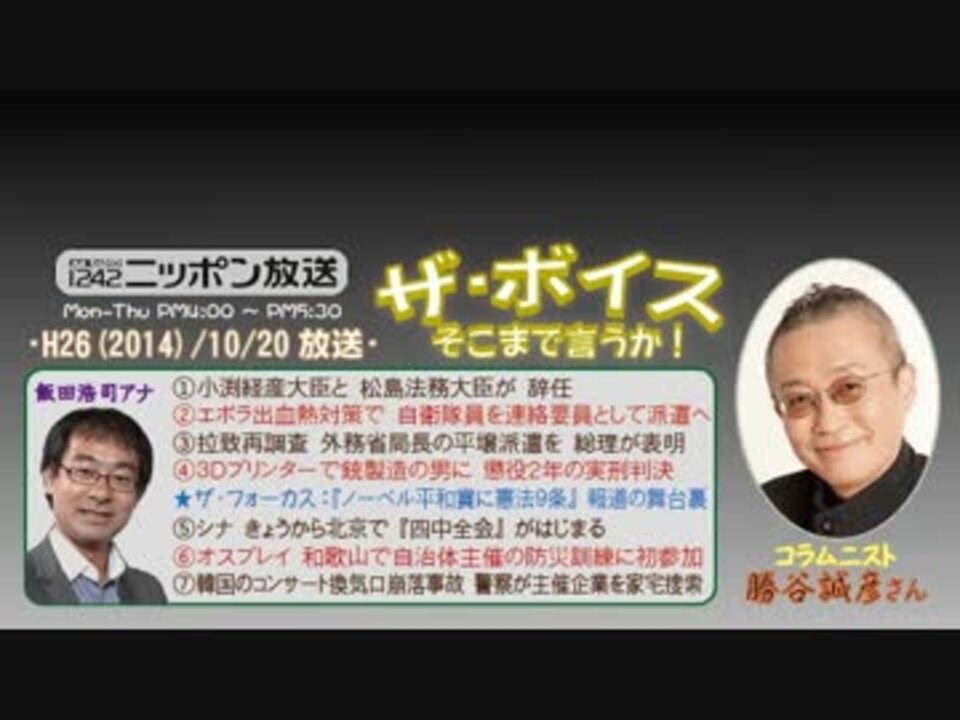 今週は2ヶ月に1度恒例の『ラジオ聴取率調査週間』に合わせた"特集企画"が組まれており、今回の題目は『歪んだ報道にダマされるな!』です。<br />勝谷さんは、先日の『ノーベル平和賞』に際し、やたらと「憲法9条が最有力!」などとのたまっていたメディアについて、そのアホさ加減と舞台裏を解説されました。<br />コレはねぇ、あれだけガンガンやられると、正直、私も「まさか本当に取ったりしないよね?!」と不安になったのも事実なので、一般の方への影響たるや……。いやはや、サヨクの常套手段「おうむ返し戦法」は、ほんと侮れないものですね(^^;<br /><br />なお、今週の街ステは、前回大好評だった『世界に誇る技術がスゴイ日本の企業』なので、お見逃し無く! ※でも飛ばす方w→ <a href="#" class="seekTime" data-seekTime="37:55" onclick="seekNicoPlayer('#37:55'); return false;">#37:55</a><br />□<a href="https://www.nicovideo.jp/mylist/36340069" target="_blank" rel="noopener">mylist/36340069</a>□<a href="https://www.nicovideo.jp/mylist/41644857" target="_blank" rel="noopener">mylist/41644857</a>