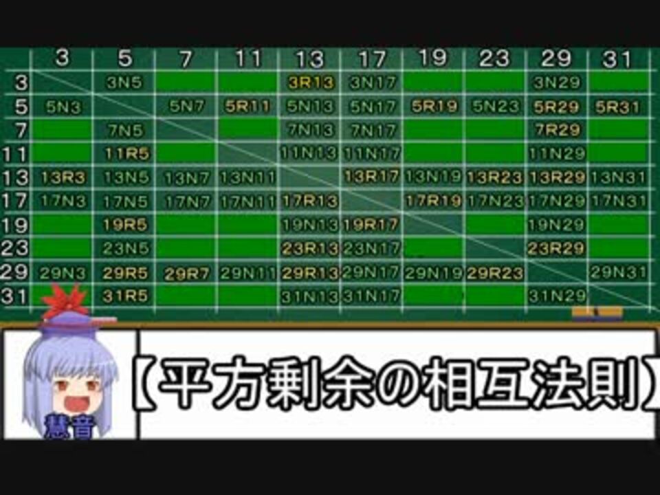 初見の方へ。初回の話はこちらからどうぞ→<a href="https://www.nicovideo.jp/watch/sm24669239" class="watch">sm24669239</a><br /><br />いよいよ本編です。<br />動画後半の【平方剰余の相互法則】については↓にも書いておきました。<br /><a href="http://zetukari.cocolog-nifty.com/blog/2014/10/post-b5c3.html" target="_blank" rel="noopener nofollow">http://zetukari.cocolog-nifty.com/blog/2014/10/post-b5c3.html</a><br /><br />前回省いた証明は入れられませんでした…。また次回という事で。<br /><br />第6回→<a href="https://www.nicovideo.jp/watch/sm24708354" class="watch">sm24708354</a><br />第8回→<a href="https://www.nicovideo.jp/watch/sm24802965" class="watch">sm24802965</a><br /><br />ゆっくり整数論→<a href="https://www.nicovideo.jp/mylist/46044337" target="_blank" rel="noopener">mylist/46044337</a><br />UPした主な動画集→<a href="https://www.nicovideo.jp/mylist/23147613" target="_blank" rel="noopener">mylist/23147613</a><br /><br />連絡等は↓でお願いします<br />Twitter:takasi_kamiyama<br />メール:takashi.kamiyama.zetsukari@gmail.com<br />ブログ:<a href="http://zetukari.cocolog-nifty.com/blog/cat59689999/" target="_blank" rel="noopener nofollow">http://zetukari.cocolog-nifty.com/blog/cat59689999/</a>