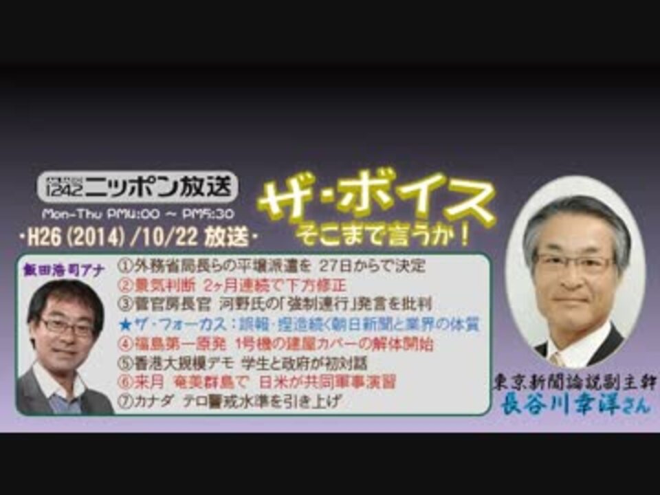 今週は2ヶ月に1度恒例の『ラジオ聴取率調査週間』に合わせた"特集企画"が組まれており、今回の題目は『歪んだ報道にダマされるな!』です。<br />長谷川さんは、数多ある朝日新聞の誤報(という名の捏造w)記事の中から、9/24夕刊および9/25朝刊で報じられた『シリア空爆』に関する物を取り上げられ、どうしてアホ記事になるのか、その理由を新聞業界の体質を交えて解説されました。<br />こちらも面白かったですが、冒頭での消費増税に関する重大な着眼点等など、今回は全体的に良かったと思います(^^<br /><br />なお、今週は、いつも以上に街ステに力を入れているため、動画うpが遅めで申し訳ないです。その分、為になるよう頑張ってますので、ぜひご覧ください! ※でも飛ばす方(^^;→ <a href="#" class="seekTime" data-seekTime="37:57" onclick="seekNicoPlayer('#37:57'); return false;">#37:57</a><br />□<a href="https://www.nicovideo.jp/mylist/36340069" target="_blank" rel="noopener">mylist/36340069</a>□<a href="https://www.nicovideo.jp/mylist/41644857" target="_blank" rel="noopener">mylist/41644857</a>