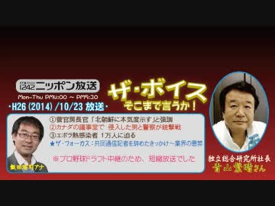 今週は2ヶ月に1度恒例の『ラジオ聴取率調査週間』に合わせた"特集企画"が組まれており、今回の題目は『歪んだ報道にダマされるな!』……ですが、今回は【プロ野球ドラフト会議】との兼ね合いで、1時間の短縮版という罠……。<br />そりゃあ私もプロ野球は人並みに好きですし、そういう文化的な生活あってこその人間社会ですし、普段はアニメ観ながら「萌え~(^^」とかのたまっているタコ助ですから、「ドラフト中継とか要らんわ!」とは言いませんが、でも、タイミング悪いよなぁと(^^;<br /><br />てなわけで、少々物足りなさはありますが、特集での『共同通信記者を辞めたきっかけ~業界の悪弊』や大好評の街ステ等など、ギュッと濃縮され聴き応えは抜群でした(^^<br />※街ステ飛ばし→ <a href="#" class="seekTime" data-seekTime="41:40" onclick="seekNicoPlayer('#41:40'); return false;">#41:40</a><br />□<a href="https://www.nicovideo.jp/mylist/36340069" target="_blank" rel="noopener">mylist/36340069</a>□<a href="https://www.nicovideo.jp/mylist/41644857" target="_blank" rel="noopener">mylist/41644857</a>