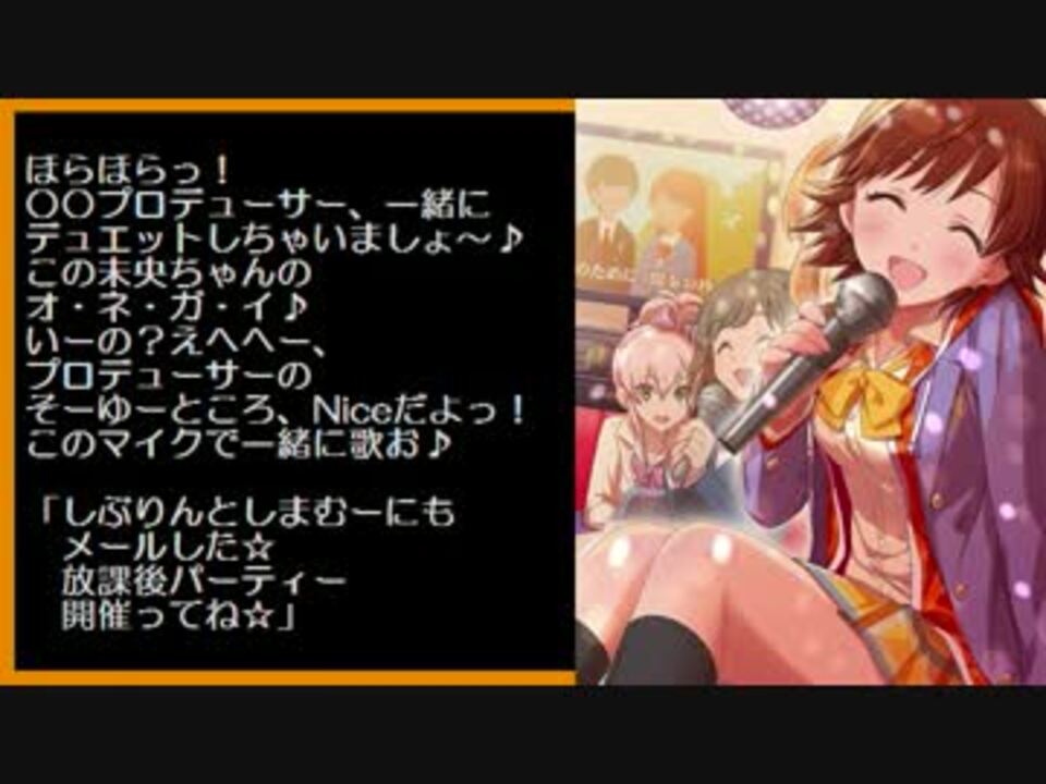 「憧れは待っててくれるから」<br />いい台詞ですね。<br />誰の言葉か、探してみてください。<br /><br />サムネにも使用した[放課後パーティー]本田未央ですが、<br />主役の未央を手前に配しつつも、中央には彼女ではなく他の娘を配することで、<br />自然と人が集まる彼女の魅力を上手に表現した構図になっていると思います。<br />楽しさの溢れる満面の笑顔、色艶を感じさせる健康的な太腿が眩しく、<br />スポットライトは桜の花びらのようでもあり、見れば見る程唸らされますね。<br /><br />収録画像……26.9.30~26.10.31<br /><br /><a href="https://www.nicovideo.jp/watch/sm24588467" class="watch">sm24588467</a> ←前作 次作→ <a href="https://www.nicovideo.jp/watch/sm25035733" class="watch">sm25035733</a><br />ガールズ紹介 <a href="https://www.nicovideo.jp/mylist/43620735" target="_blank" rel="noopener">mylist/43620735</a><br />使用曲関連 <a href="https://www.nicovideo.jp/mylist/44692535" target="_blank" rel="noopener">mylist/44692535</a><br />偉大な先人の動画 <a href="https://www.nicovideo.jp/watch/sm22723720" class="watch">sm22723720</a><br />