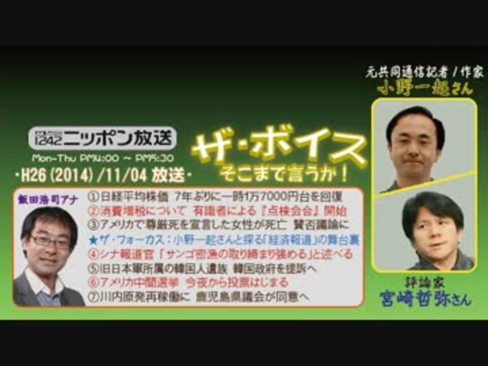 今回は、予告無しのサプライズとして、経済通の特別ゲストが登場!<br />宮崎さんの友人で経済通といえば、ご存じ飯田泰之さん……かと思いきや、招かれたのは、共同通信社の元記者で作家の小野一起(かずき)さんという二重のサプライズ!! ~と、検索しても全然引っかからず、放送中は誰なのかさっぱり分からなかったのですが、「一起」というのはペンネームで、本名は小野展克(のぶかつ)さんだというオチでした(^^;<br />※番組中の呼称が「一起」の方だったので、画像の氏名もそちらに。<br /><br />そんなわけで、いつもよりも濃いぃ経済話……特に、先日の黒田バズーカ第2弾が何故このタイミングだったのか、私的に一番しっくりときた解説等など、今回も必聴です!<br />※街ステ飛ばし→<a href="#" class="seekTime" data-seekTime="39:11" onclick="seekNicoPlayer('#39:11'); return false;">#39:11</a><br />□<a href="https://www.nicovideo.jp/mylist/36340069" target="_blank" rel="noopener">mylist/36340069</a>□<a href="https://www.nicovideo.jp/mylist/41644857" target="_blank" rel="noopener">mylist/41644857</a>