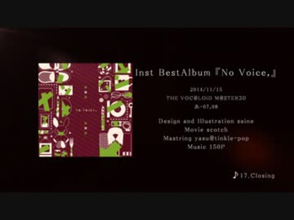 音が出なくなるまで叫べ。<br /><br />Inst BestAlbum「No Voice,」<br /><br />Design and Illustration saine (<a href="https://www.nicovideo.jp/mylist/18701448" target="_blank" rel="noopener">mylist/18701448</a> @sainexxx)<br />Movie scotch (<a href="https://www.nicovideo.jp/mylist/28212980" target="_blank" rel="noopener">mylist/28212980</a> @scotch0116)<br />Mastring yasu@tinkle-pop (<a href="https://www.nicovideo.jp/mylist/24600477" target="_blank" rel="noopener">mylist/24600477</a> @yasu_Tinkle)<br /><br />Music 150P (<a href="https://www.nicovideo.jp/mylist/13610527" target="_blank" rel="noopener">mylist/13610527</a> @150p)<br /><br />あ-05,06 「Kill the broccoli 150%」<br />あ-07,08 「suzumusic」<br />2014/11/15<br />会場頒布価格1000円<br /><br />通販などの詳細 → <a href="https://ch.nicovideo.jp/article/ar395908" target="_blank" rel="noopener">ar395908</a> (随時更新します)<br /><br />スズム→『No Cry.』<a href="https://www.nicovideo.jp/watch/sm24905165" class="watch">sm24905165</a><br />