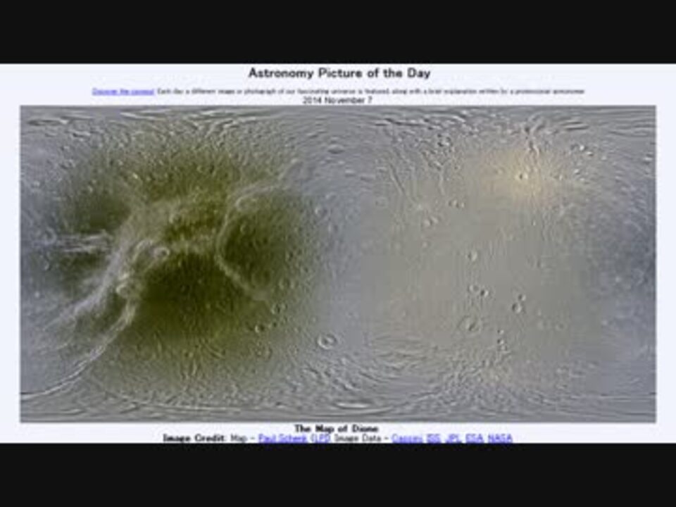<b>2014年11月7日Astronomy Picture of the Day<br />The Map of Dione 「ディオネの地図」</b><br /><br />APODとはNASAの天文学者が、毎日天文に関する画像に説明を添えて公開しているサイトです。<br />英語の勉強に読んでます。間違いがあれば指摘頂けると嬉しいです。<br /><br /><b>美しい写真と原文</b><br /><a href="http://apod.nasa.gov/apod/ap141107.html" target="_blank" rel="noopener nofollow">http://apod.nasa.gov/apod/ap141107.html</a><br /><b>お借りした音源</b><br /><a href="https://commons.nicovideo.jp/works/nc86506" target="_blank" rel="noopener">nc86506</a>「fontain」 by magozo<br /><br />APODreadingマイリスト <a href="https://www.nicovideo.jp/mylist/32170692" target="_blank" rel="noopener">mylist/32170692</a> (<a href="https://www.nicovideo.jp/watch/sm24915049" class="watch">sm24915049</a><前日 翌日><a href="https://www.nicovideo.jp/watch/sm24932533" class="watch">sm24932533</a>)<br /><br />Twitter:Cc_jabberwock <br /><br />転載はご遠慮下さい。解らない事が有ったら気軽に聞いてみて下さい。調べてきます<br />宣伝ありがとうございます。