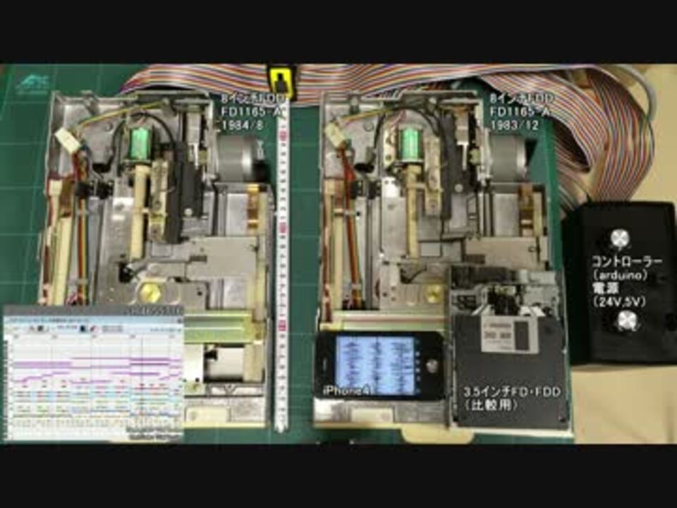 8インチFDD2台で「東方地霊殿『少女さとり ~ 3rd eye』を耳コピ+勝手にlong.verにしてみた」(<a href="https://www.nicovideo.jp/watch/sm4655716" class="watch">sm4655716</a>)を演奏しました。<br />「Moppy-Advanced」を使用し「Arduino Nano」で制御しています。<br />画面内のiPhone4では「地震計 - iSeismometer」というアプリを動かしています。<br />振動が凄い事が伝わるかな、と思い載せました。<br /><br />3.5インチFDDの場合、5V4Aの電源で8台以上動かせました。<br />今回の8インチFDD2台では、24Vと5Vの電源が必要となり、アイドル状態でも26W消費します。<br />一曲終えると部分によっては60度以上になります。<br /><br />他の曲もどうぞ<br /><a href="https://www.nicovideo.jp/mylist/39100799" target="_blank" rel="noopener">mylist/39100799</a><br /><br />YouTube版<br /><a href="http://goo.gl/DgZ26f" target="_blank" rel="noopener nofollow">http://goo.gl/DgZ26f</a><br />