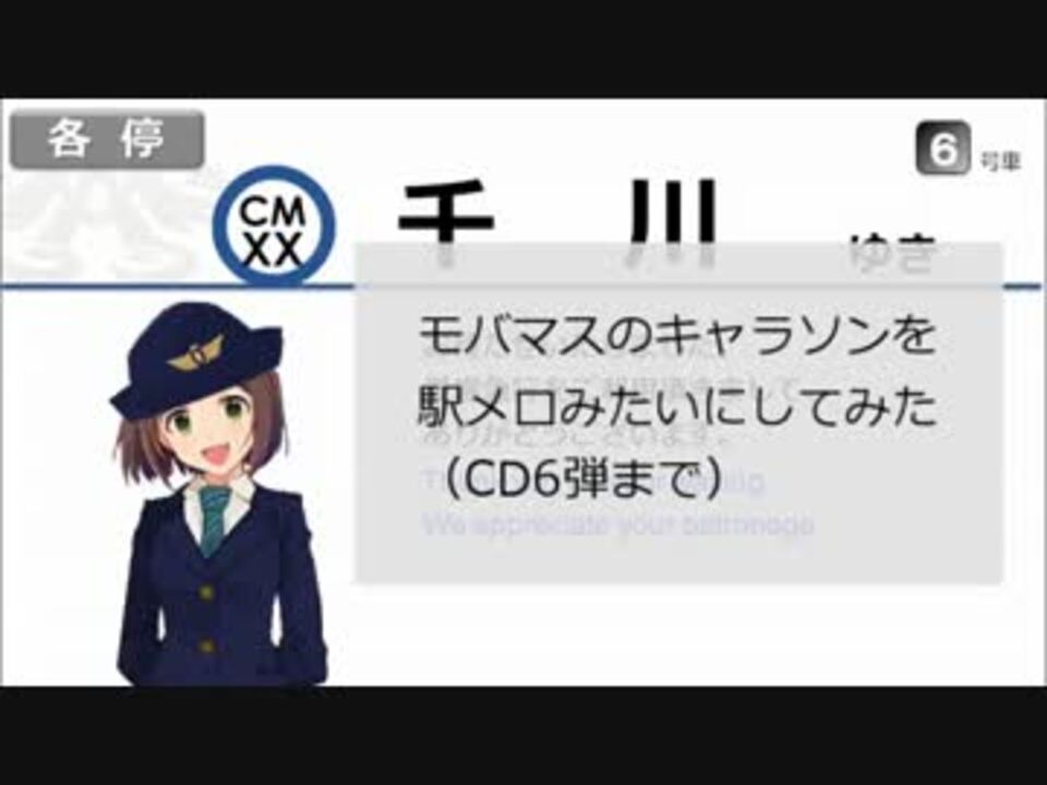 <font color="red"><font size="5">【速報】美城線11/18ダイヤ修正<br />有栖川・片桐・桜井の3駅が追加開業!→<a href="https://www.nicovideo.jp/watch/sm27682200" class="watch">sm27682200</a></font></font><br /><br />6弾までのCD曲+1曲を改造。<br />うちお約束のマッシュアップ&オマージュは10曲。FM音源便利すぎ。<br />乗換→<a href="https://www.nicovideo.jp/mylist/12107717" target="_blank" rel="noopener">mylist/12107717</a><br />※ネタについて<br />・特急、急行の停車駅はコメされた方のご指摘のとおりです。<br /> ダイヤは年一回改正され、停車駅追加や新駅開業が決まります。<br />・17駅目の誤字(?)は最近本当にあった話です。<br />・路線名の新貞羅はシンデレラの漢字表記由来ですが、すぐ美城線へと改称された模様。<br /><font size="5">【新作】16歳3人衆が首都圏大回り→<a href="https://www.nicovideo.jp/watch/sm26422165" class="watch">sm26422165</a></font>