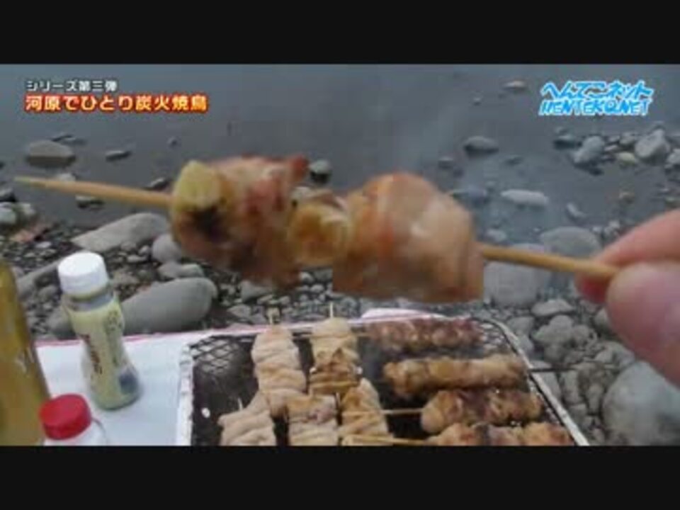 河原で焼鳥、アスパラベーコン巻、そしてチョリソーを焼きつつエビスビールを飲みました。この開放感、香ばしさ、美味さが伝わるといいんだが。煙を眺め焼鳥はタレか塩かと迷ううちに、日は沈み月は登ってゆく。<br /><br /><a href="https://www.nicovideo.jp/watch/sm15852154" class="watch">sm15852154</a>の音声やフォント等を調整し、プレミアム画質で投稿しなおしました。<br /><br />次の動画(シリーズ第四弾・ソーセージ)→<a href="https://www.nicovideo.jp/watch/sm25048048" class="watch">sm25048048</a><br /><br />YouTube版はニコ動以上のハイビジョン高画質・高音質 <a href="http://henteko.net/YouTubeBBQ" target="_blank" rel="noopener nofollow">http://henteko.net/YouTubeBBQ</a><br /><br />今後も河原シリーズ(<a href="https://www.nicovideo.jp/mylist/47136549" target="_blank" rel="noopener">mylist/47136549</a>)を高画質で投稿していくので、投稿者のお気に入り登録をお願いします!<br /><b>今後焼いて欲しいもののリクエストがあったらコメントよろしく</b>