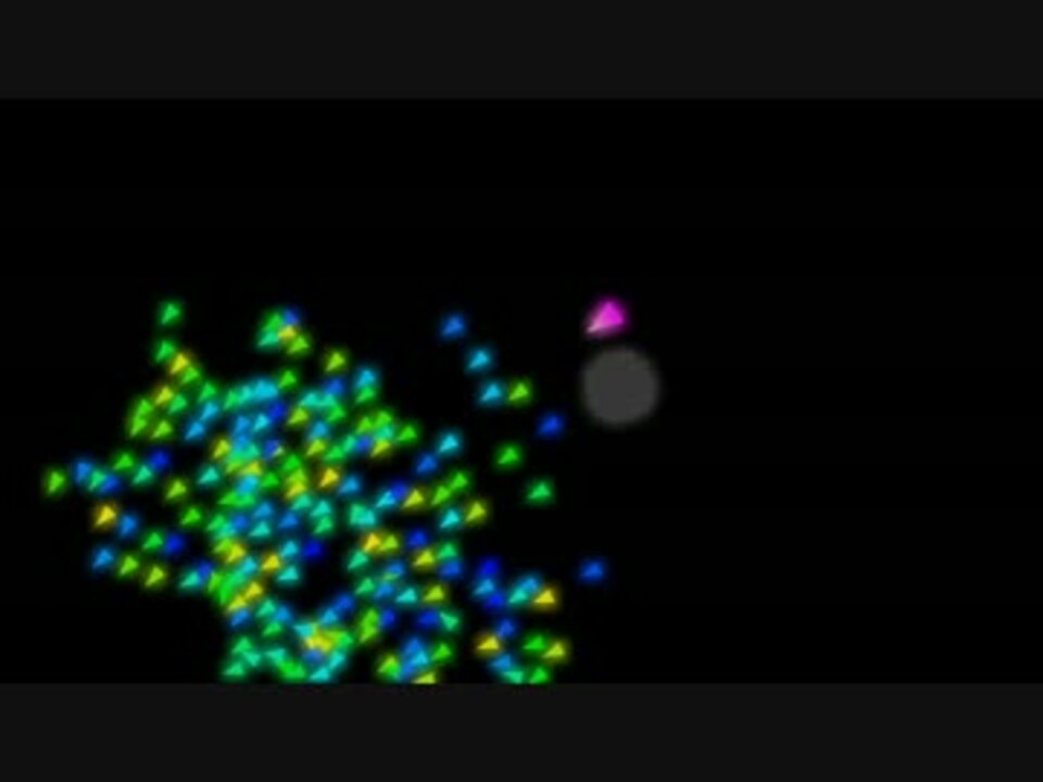 歌はないけど、すずきつづみさんがしゃべりますよ~。<br />しかしこれ、音楽の動画なんだか、シミュレーションプログラムの動画なんだか。。。<br /><br />Boidとは「bird-oid(鳥もどき)」の意。群れをなす鳥のモデル。各Boidは次のように考えて移動します。<br /><br />1.群れの中央に向かいたい<br />2.他個体に近づきすぎるのはいや<br />3.みんなと同じスピードで移動したい<br /><br />これが基本ルール。この動画のシミュレーションではこれらに加えて、次の2つのルールを追加してあります。<br /><br />4.捕食者(predator)から離れたい<br />5.エサ(food)に近づきたい<br /><br />-----------------------------------<br />ボカロ曲→<a href="https://www.nicovideo.jp/mylist/44727220" target="_blank" rel="noopener">mylist/44727220</a><br />インスト→<a href="https://www.nicovideo.jp/mylist/44727396" target="_blank" rel="noopener">mylist/44727396</a><br />テクノを作ろう!→<a href="https://www.nicovideo.jp/mylist/44877380" target="_blank" rel="noopener">mylist/44877380</a><br />twitter.com/nyangle<br /><font color="#111111"><br />*+✰+*――*+✰+*――*+✰+*――*+✰+*―― <br />お店</font> → <a href="https://nyangle.official.ec/" target="_blank" rel="noopener nofollow">https://nyangle.official.ec/</a><font color="#111111"> <br />*+✰+*――*+✰+*――*+✰+*――*+✰+*――</font> <br />