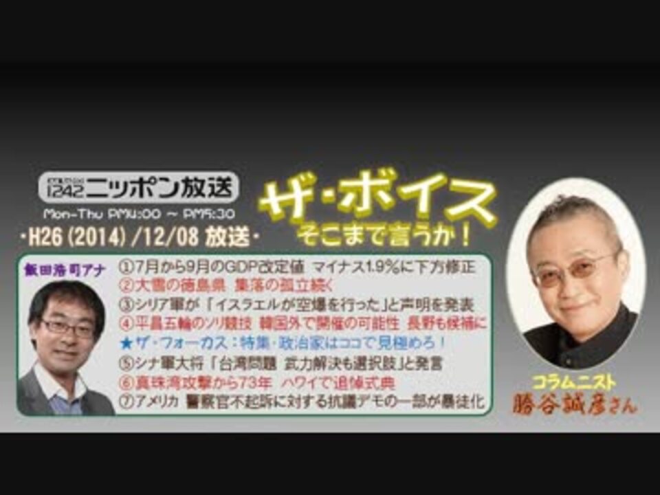 今週は、ニッポン放送で2ヶ月に一度の恒例行事【ファン大感謝ウィーク(という名の聴取率調査対策週間^^;)】が各番組で繰り広げられていて、この『ザ・ボイス』では、既報の通り「選挙直前!政治家はココで見極めろ!」という特集が組まれています。<br />勝谷誠彦流の「政治家の選び方」とはどんなものか、ぜひお聴きください!<br />※ちなみに私的な選び方その1:「公約」に具体性や現実性が有るか否か。抽象的・理想論的すぎるものはNGです。<br /><br />ところで、今週の街ステでは、過去2回の特別週と同様に『技術がスゴイ!日本の企業』が日替わりで紹介されますから、普段は飛ばしがちな方も要チェックです!<br />こちらも、イイ感じに恒例企画となりそうですね♪<br />※街ステ飛ばし→ <a href="#" class="seekTime" data-seekTime="39:28" onclick="seekNicoPlayer('#39:28'); return false;">#39:28</a><br />□<a href="https://www.nicovideo.jp/mylist/36340069" target="_blank" rel="noopener">mylist/36340069</a>□<a href="https://www.nicovideo.jp/mylist/41644857" target="_blank" rel="noopener">mylist/41644857</a>