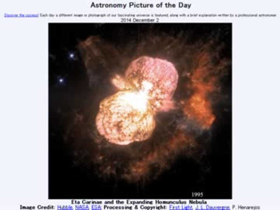 <b>2014年 12月2 日Astronomy Picture of the Day<br />Eta Carinae and the Expanding Homunculus Nebula 「りゅうこつ座イータ星と、膨張を続ける/ニンギョウセ'イウン」</b><br /><br />APODとはNASAの天文学者が、毎日天文に関する画像に説明を添えて公開しているサイトです。<br />英語の勉強に読んでます。間違いがあれば指摘頂けると嬉しいです。<br /><br /><b>美しい写真と原文</b><br /><a href="http://apod.nasa.gov/apod/ap141202.html" target="_blank" rel="noopener nofollow">http://apod.nasa.gov/apod/ap141202.html</a><br /><b>お借りした素材</b><br />Wikipediaより<br />"One Picture, Many Stories" by ESO/B. Tafresh<br />"ESO-Eta Carinae-phot-17a-08-normal" by ESO<br /><b>お借りした音源</b><br /><a href="https://commons.nicovideo.jp/works/nc81815" target="_blank" rel="noopener">nc81815</a>「醜悪な人形たちの踊り」 by すだれ<br /><br />APODreadingマイリスト <a href="https://www.nicovideo.jp/mylist/32170692" target="_blank" rel="noopener">mylist/32170692</a> (<a href="https://www.nicovideo.jp/watch/sm25095114" class="watch">sm25095114</a><前日 翌日><a href="https://www.nicovideo.jp/watch/sm25107719" class="watch">sm25107719</a>)<br /><br />転載はご遠慮下さい。<br />ジェット、衝撃波面 ヒゲが正直正しいか不明