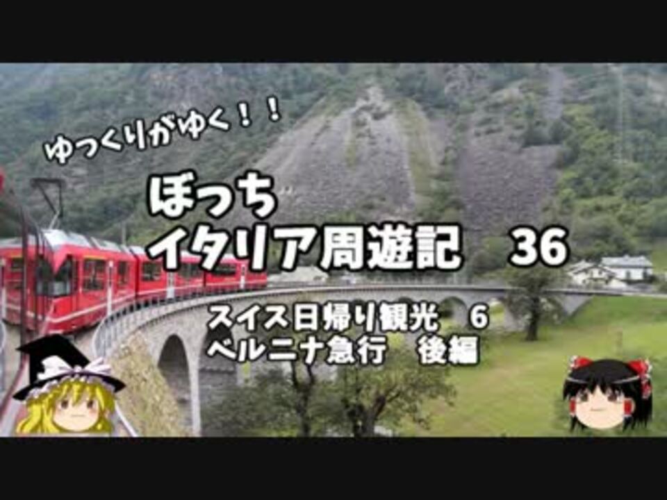 前回引き続き、ベルニナ急行乗車の様子です<br />一等席はガラガラで快適でした!<br />これで晴れていれば・・・・。<br />カメラの質問が多い為、過去の動画を紹介 3分50秒頃です→<a href="https://www.nicovideo.jp/watch/sm23636534" class="watch">sm23636534</a><br /><br />1日目…出発編<br />2~4日目…ヴェネツィア編<br />5~7日目…ミラノ スイス編<font color="red">←今ココ(6日目)</font><br />8~10日目…ローマ 南イタリア編<br />11~12日目…帰路編<br /><br />たくさんのコメントありがとうございます!<br />1月末 完結に向けて、鋭意作成中です!<br />旅ブログ→<a href="http://ryotaroo.blog.fc2.com/" target="_blank" rel="noopener nofollow">http://ryotaroo.blog.fc2.com/</a><br /><br /><br /><a href="https://www.nicovideo.jp/watch/sm25108841" class="watch">sm25108841</a>←前回 <font color="red">次回 第37話→<a href="https://www.nicovideo.jp/watch/sm25136350" class="watch">sm25136350</a></font><br />前作→<a href="https://www.nicovideo.jp/mylist/44343854" target="_blank" rel="noopener">mylist/44343854</a><br />今作→<a href="https://www.nicovideo.jp/mylist/45763559" target="_blank" rel="noopener">mylist/45763559</a>