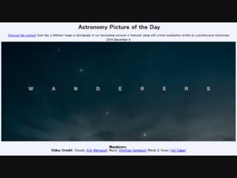<b>2014年12月8日Astronomy Picture of the Day<br />Wanderers 「ワンダラーズ」</b><br /><br />APODとはNASAの天文学者が、毎日天文に関する画像に説明を添えて公開しているサイトです。<br />英語の勉強に読んでます。間違いがあれば指摘頂けると嬉しいです。<br /><br /><b>美しい写真と原文</b><br /><a href="http://apod.nasa.gov/apod/ap141208.html" target="_blank" rel="noopener nofollow">http://apod.nasa.gov/apod/ap141208.html</a><br /><br />APODreadingマイリスト <a href="https://www.nicovideo.jp/mylist/32170692" target="_blank" rel="noopener">mylist/32170692</a> (<a href="https://www.nicovideo.jp/watch/sm25136252" class="watch">sm25136252</a><前日 翌日><a href="https://www.nicovideo.jp/watch/sm25151137" class="watch">sm25151137</a>)<br /><br />Twitter:Cc_jabberwock <br /><br />転載はご遠慮下さい。解らない事が有ったら気軽に聞いてみて下さい。調べてきます<br />カール・セーガンの朗読も訳そうかと思ったのですがヘルペスに罹患してかゆくてかゆくて仕方ないので断念<br />こちらの方が訳されていたので、オリジナルと共に是非 <a href="http://goo.gl/j7hoSS" target="_blank" rel="noopener nofollow">http://goo.gl/j7hoSS</a>