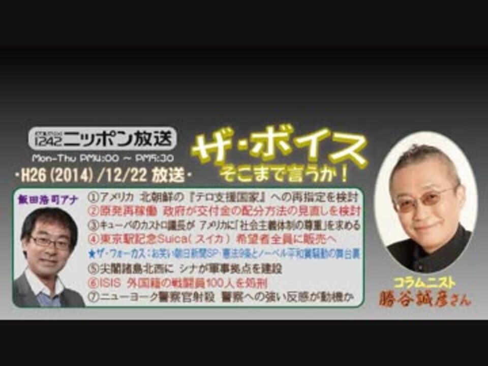 先日に渡辺雅隆新社長が就任し、「創業以来の危機だ。これまでの手法や意識を根本的に見直し、根底から朝日新聞社を作りかえる!(キリッ」などと改革をアピールしていた朝日ですが、やはり何も変わっていないようですねw<br /><br />今回の『ザ・フォーカス』では、そんな相も変わらぬアホで姑息な朝日の体質を暴露し、笑い飛ばした勝谷さんですが、その中でちょっと話題に出た『韓国でも始まった"憲法9条にノーベル平和賞を"運動』には続きがありましてね。その韓国人たちは、「この活動は安重根の思想を受け継ぐものだ。それが平和憲法への流れになった!(意訳」などと意味不明なことを謳っているんですよ。これを載せないあたりもアサヒってますよねぇw<br />※街ステ飛ばし→ <a href="#" class="seekTime" data-seekTime="37:17" onclick="seekNicoPlayer('#37:17'); return false;">#37:17</a><br />□<a href="https://www.nicovideo.jp/mylist/36340069" target="_blank" rel="noopener">mylist/36340069</a>□<a href="https://www.nicovideo.jp/mylist/41644857" target="_blank" rel="noopener">mylist/41644857</a>