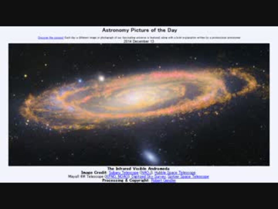 <b>2014年 12月13日 Astronomy Picture of the Day<br />The Infrared Visible Andromeda 「赤外線と可視光のアンドロメダ銀河」</b><br /><br />APODとはNASAの天文学者が、毎日天文に関する画像に説明を添えて公開しているサイトです。<br />英語の勉強に読んでます。間違いがあれば指摘頂けると嬉しいです。<br /><br /><b>美しい写真と原文</b><br /><a href="http://apod.nasa.gov/apod/ap141213.html" target="_blank" rel="noopener nofollow">http://apod.nasa.gov/apod/ap141213.html</a><br /><b>お借りした素材</b><br />Wikipediaより<br />"Andromeda Galaxy (with h-alpha)" by Adam Evans<br />"Kittpeakteliscope" by Montebest<br />"Local Galactic Group" by Andrew Z. Colvin<br />Flickrより<br />"Subaru Telescope" by Ed Dunens<br /><b>お借りした音源</b><br /><a href="https://commons.nicovideo.jp/works/nc92197" target="_blank" rel="noopener">nc92197</a>「game_image17」 by Naturanotes(UG)<br /><br />APODreadingマイリスト <a href="https://www.nicovideo.jp/mylist/32170692" target="_blank" rel="noopener">mylist/32170692</a> (<a href="https://www.nicovideo.jp/watch/sm25174594" class="watch">sm25174594</a><前日 翌日><a href="https://www.nicovideo.jp/watch/sm25189726" class="watch">sm25189726</a>)<br /><br />転載はご遠慮下さい。