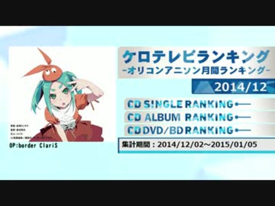 [HP]<a href="http://www20.atwiki.jp/keroro00innovator/" target="_blank" rel="noopener nofollow">http://www20.atwiki.jp/keroro00innovator/</a><br />デイリー:<a href="http://www20.atwiki.jp/keroro00innovator/pages/25.html" target="_blank" rel="noopener nofollow">http://www20.atwiki.jp/keroro00innovator/pages/25.html</a><br />週間:<a href="http://www20.atwiki.jp/keroro00innovator/pages/26.html" target="_blank" rel="noopener nofollow">http://www20.atwiki.jp/keroro00innovator/pages/26.html</a><br />2014年12月度のランキングです。<br />基本的にアニメソングのみ。除外基準:<a href="http://www20.atwiki.jp/keroro00innovator/pages/4.html" target="_blank" rel="noopener nofollow">http://www20.atwiki.jp/keroro00innovator/pages/4.html</a><br />2014月11月:<a href="https://www.nicovideo.jp/watch/sm25045058" class="watch">sm25045058</a> 2015年1月:<a href="https://www.nicovideo.jp/watch/sm25489917" class="watch">sm25489917</a> ランキング一覧:<a href="https://www.nicovideo.jp/mylist/47656494" target="_blank" rel="noopener">mylist/47656494</a>