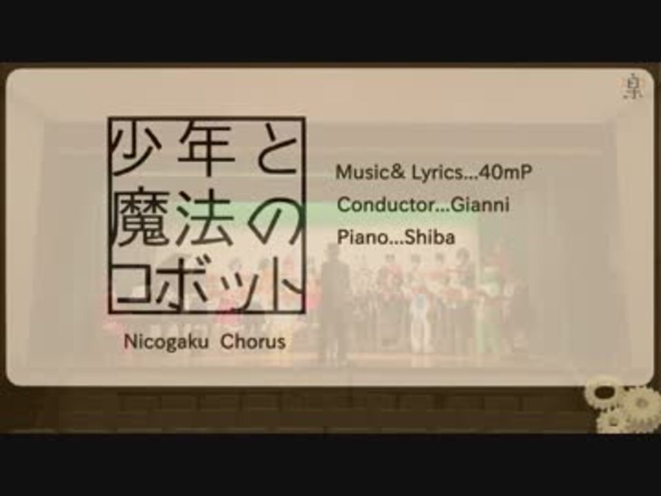 こんにちは、ニコ楽合唱団です!<br /><br />今回は、40mP自らがニコニコアプリでスレマしている「少年と魔法のロボット」を混声四部合唱でお届けします。<br /><br />あの日、一緒に歌ったうた、<br />私たちは今でも、覚えているから。<br /><br />原曲:少年と魔法のロボット(<a href="https://www.nicovideo.jp/watch/sm21919571" class="watch">sm21919571</a>)<br /><br />指揮:ジャンニ(<a href="https://www.nicovideo.jp/mylist/34351853" target="_blank" rel="noopener">mylist/34351853</a>)<br />伴奏:シバ<br />編曲:yukiya<br />動画:みーさん(<a href="https://www.nicovideo.jp/mylist/41695639" target="_blank" rel="noopener">mylist/41695639</a>)<br />録音:有壽夷 禮子(Pietoso)(<a href="https://www.nicovideo.jp/mylist/43563541" target="_blank" rel="noopener">mylist/43563541</a>)<br /><br />ブログ→<a href="http://nico2wind.blog59.fc2.com/" target="_blank" rel="noopener nofollow">http://nico2wind.blog59.fc2.com/</a><br />公式twitter→@nico2gakudan_o<br />ニコ楽全体マイリスト→<a href="https://www.nicovideo.jp/mylist/34359881" target="_blank" rel="noopener">mylist/34359881</a><br />合唱団マイリスト→<a href="https://www.nicovideo.jp/mylist/45456798" target="_blank" rel="noopener">mylist/45456798</a><br /><br />2015年10月より合唱団パンドラボックスとして活動しています<br />公式HP→<a href="http://chorus-pandorabox.jimdo.com/" target="_blank" rel="noopener nofollow">http://chorus-pandorabox.jimdo.com/</a><br />公式twitter→@chor_pandorabox