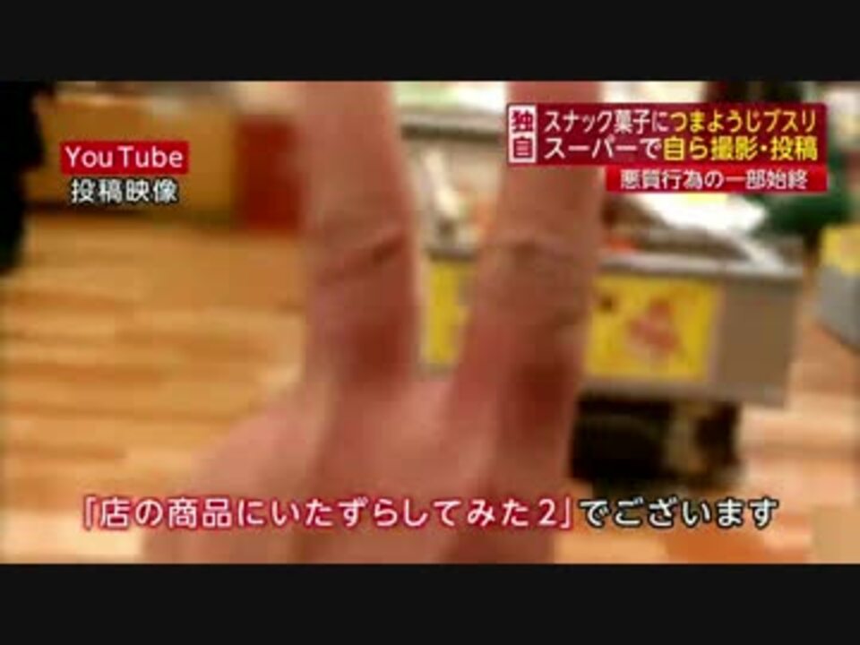 報道によると、食品への異物混入が相次ぐ中、スーパーのスナック菓子に、つまようじを故意に入れる一部始終を撮影した悪質な動画がYoutubeに投稿され、波紋を広げている。<br />元サイト<a href="http://youtu.be/ZW3iO6m1vIE" target="_blank" rel="noopener nofollow">http://youtu.be/ZW3iO6m1vIE</a><br />問題の動画:タイトル名「店の商品にいたずらしてみたw2」<br />URL→<a href="http://youtu.be/IW7H5_XpT_4" target="_blank" rel="noopener nofollow">http://youtu.be/IW7H5_XpT_4</a><br /><br />【追加コメント】<br />ちなみに、犯人はまだ続けている。なんとsanwa(スーパー)でじゃがりこに1円玉をワザと混入するシーンが投稿された。しかし、指名手配以降更新の様子は無い。<br />URL→<a href="http://youtu.be/NWsUT25bOss" target="_blank" rel="noopener nofollow">http://youtu.be/NWsUT25bOss</a><br /><font color="red">18日、ついに犯人は逮捕された。→<a href="https://www.nicovideo.jp/watch/sm25372236" class="watch">sm25372236</a></font>