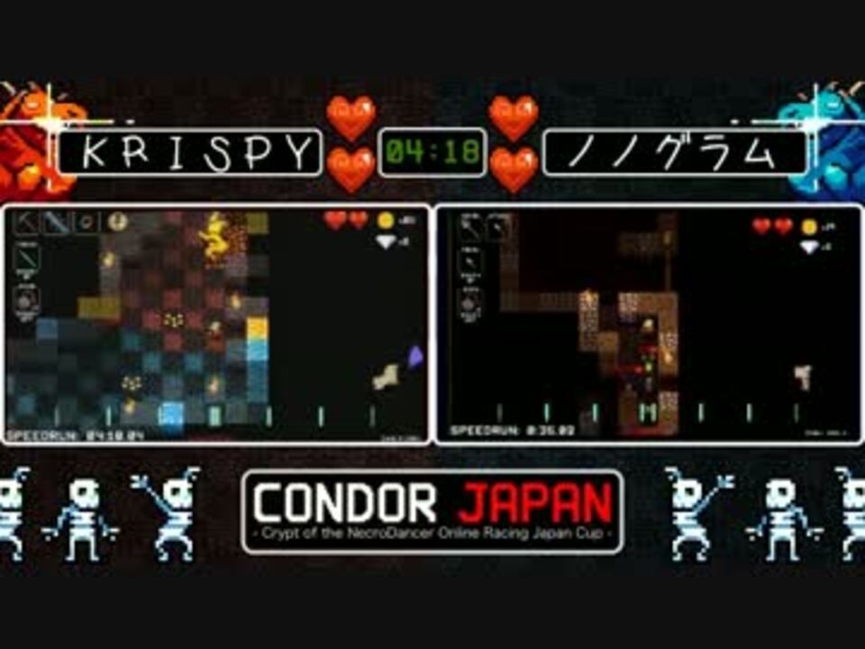 この動画は2015年1月17日にニコ生でおこなったネクロダンサー大会<br />CoNDOR(Crypt of the NecroDancer Online Racing)Japan Under8の決勝戦を<br />録画したものです。TSの代わりです。参加者等詳細→<a href="https://ch.nicovideo.jp/article/ar700669" target="_blank" rel="noopener">ar700669</a> ルールとか→<a href="https://ch.nicovideo.jp/article/ar693945" target="_blank" rel="noopener">ar693945</a><br /><br />みんなも買おう→ <a href="http://store.steampowered.com/app/247080" target="_blank" rel="noopener nofollow">http://store.steampowered.com/app/247080</a><br /><br />コミュ経由で来てコメント出来無い人→<a href="https://www.nicovideo.jp/watch/sm25386417" class="watch">sm25386417</a><br /><br />Twitter→ <a href="https://twitter.com/poez" target="_blank" rel="noopener nofollow">https://twitter.com/poez</a>