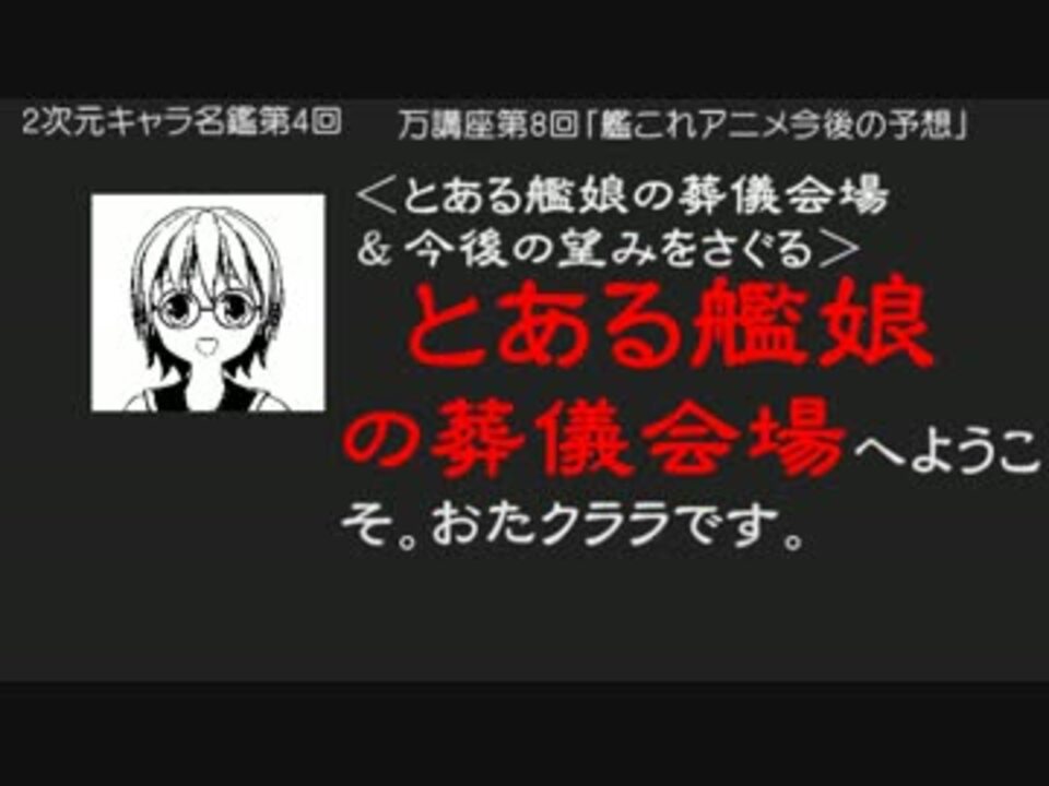 <b>劇場版で、予想がどこまで当たったか検証→ <a href="https://www.nicovideo.jp/watch/sm30157857" class="watch">sm30157857</a></b><br /><br />「艦これ」アニメの第3話を見てしまいました…。今後の展開に望みの持てる余地はないのか、祈りを込めながら予想しました(←ウソはついてない)<br /><br />←前作 艦これ×風林火山 <a href="https://www.nicovideo.jp/watch/sm25406486" class="watch">sm25406486</a><br />→次作 <続編>【艦これ】史実再現でOP艦はどこまで海色(轟沈色)に溶けてしまうのか?(※如月ちゃんのように、史実通りでみんな沈められたらどうなる?)<a href="https://www.nicovideo.jp/watch/sm25446796" class="watch">sm25446796</a><br /><br />---<br />2次元キャラ名鑑<br /> ←第3回 艦これ 川内・神通・那珂ちゃん <a href="https://www.nicovideo.jp/watch/sm25373508" class="watch">sm25373508</a>/→第5回 艦これ アニメオープニング艦 同上 リスト<a href="https://www.nicovideo.jp/mylist/48020146" target="_blank" rel="noopener">mylist/48020146</a><br />万講座<br /> ←第7回 同上<※講義形式ではないけど> /→第9回 同上 リスト <a href="https://www.nicovideo.jp/mylist/48030837" target="_blank" rel="noopener">mylist/48030837</a><br />===<br />投稿したもの <a href="https://www.nicovideo.jp/mylist/45322744" target="_blank" rel="noopener">mylist/45322744</a>