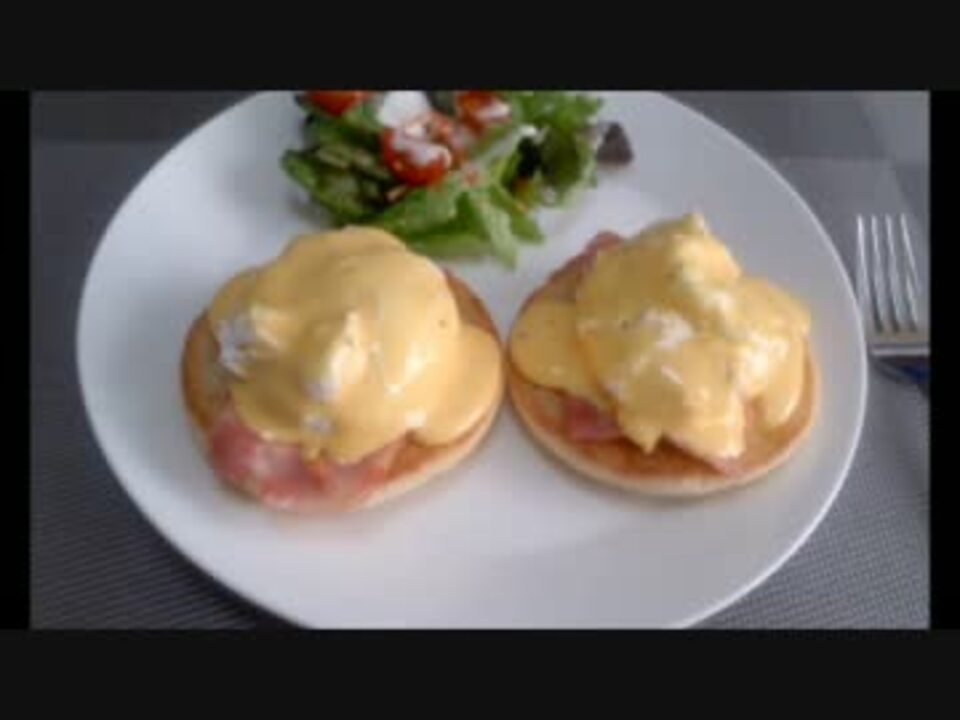 エッグベネディクト(英語: Eggs Benedict)は、イングリッシュ・マフィンの半分にハムやベーコンまたはサーモンなど、ポーチドエッグ、オランデーズソースを乗せて作る料理である。<br /><br /><br />【エッグベネディクト】材料(1人分)<br /><br />■卵 2個<br />■イングリッシュマフィン 1個<br />■ベーコン 2枚<br /><br />■オランデーズソース<br />・卵黄 1個<br />・バター 10g<br />・塩、こしょう 少々<br />・レモン汁 少々<br /><br /><br />※コメントありがとうございます、バターの分量間違いです。<br />【訂正】バター50g→10g<br /><br /><br /><br />次⇒簡単に卵黄を分ける方法(<a href="https://www.nicovideo.jp/watch/sm25496556" class="watch">sm25496556</a>)