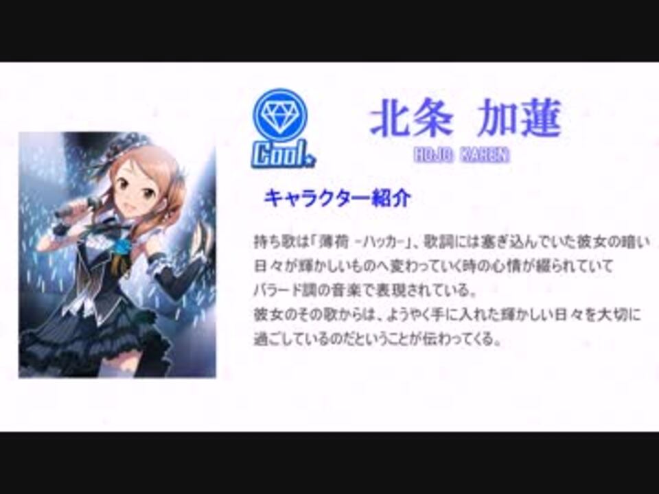 この動画の趣旨、注意事項はpart1を参照してください<br>何人のアイドルを紹介しようかと考えた結果、キービジュアルの30人+残りのCD第6弾組の2人+声がついた時期的にアニメ出演があり得そうな2人の計34人を紹介することにしました<br>ガチャ更新まで待っての投稿でしたが、半分予想が当たり半分外れました。ちゃま…<br>番外編→ 茄子の紹介動画→<a href="https://www.nicovideo.jp/mylist/48156627" target="_blank" rel="noopener">mylist/48156627</a>