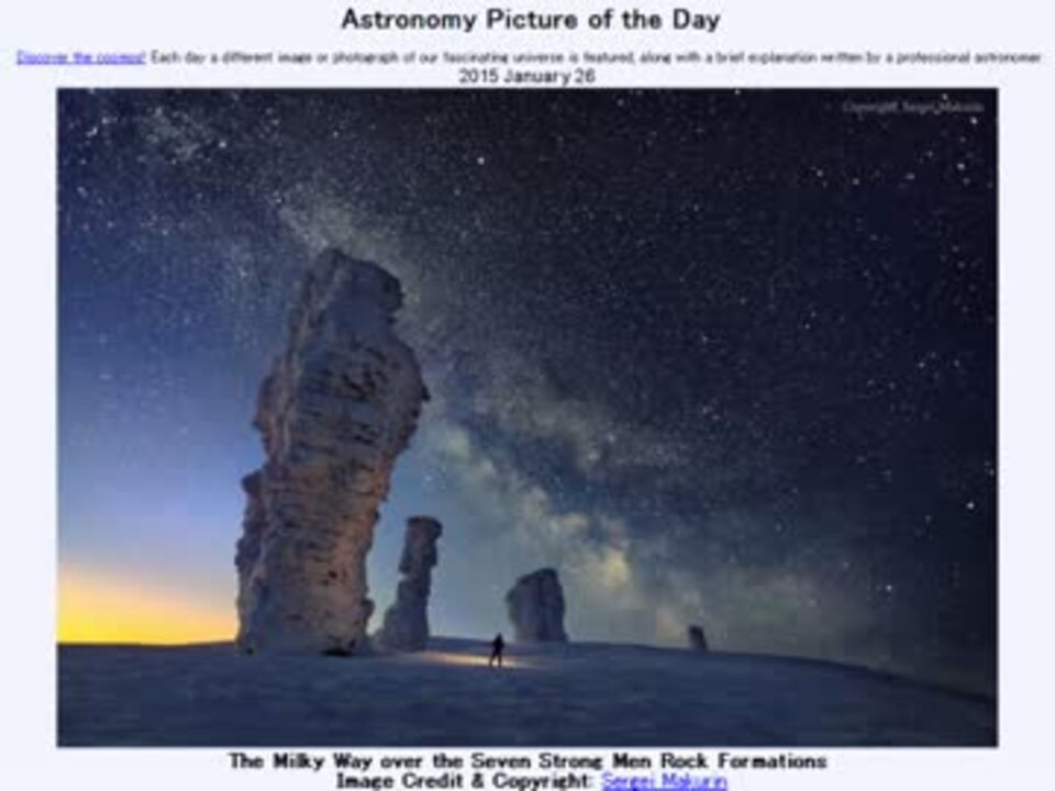 <b>2015年 1月26日 Astronomy Picture of the Day<br />The Milky Way over the Seven Strong Men Rock Formations 「七人の強者岩にかかる天の川」</b><br /><br />APODとはNASAの天文学者が、毎日天文に関する画像に説明を添えて公開しているサイトです。<br />英語の勉強に読んでます。間違いがあれば指摘頂けると嬉しいです。<br /><br /><b>美しい写真と原文</b><br /><a href="http://apod.nasa.gov/apod/ap150126.html" target="_blank" rel="noopener nofollow">http://apod.nasa.gov/apod/ap150126.html</a><br /><b>お借りした素材</b><br />Wikipediaより<br />"Russia edcp relief location map" by Uwe Dedering<br />Youtubeより<br />"Вертолётная экспедиция на Маньпупунёр, 2012" by Aviamarket<br /><b>お借りした音源</b><br /><a href="https://commons.nicovideo.jp/works/nc100812" target="_blank" rel="noopener">nc100812</a>「恋人と過ごす雪の夜的なBGM」 by タカオ マサキ<br /><br />APODreadingマイリスト <a href="https://www.nicovideo.jp/mylist/32170692" target="_blank" rel="noopener">mylist/32170692</a> (<a href="https://www.nicovideo.jp/watch/sm25507187" class="watch">sm25507187</a><前日 翌日><a href="https://www.nicovideo.jp/watch/sm25514783" class="watch">sm25514783</a>)<br /><br />転載はご遠慮下さい。
